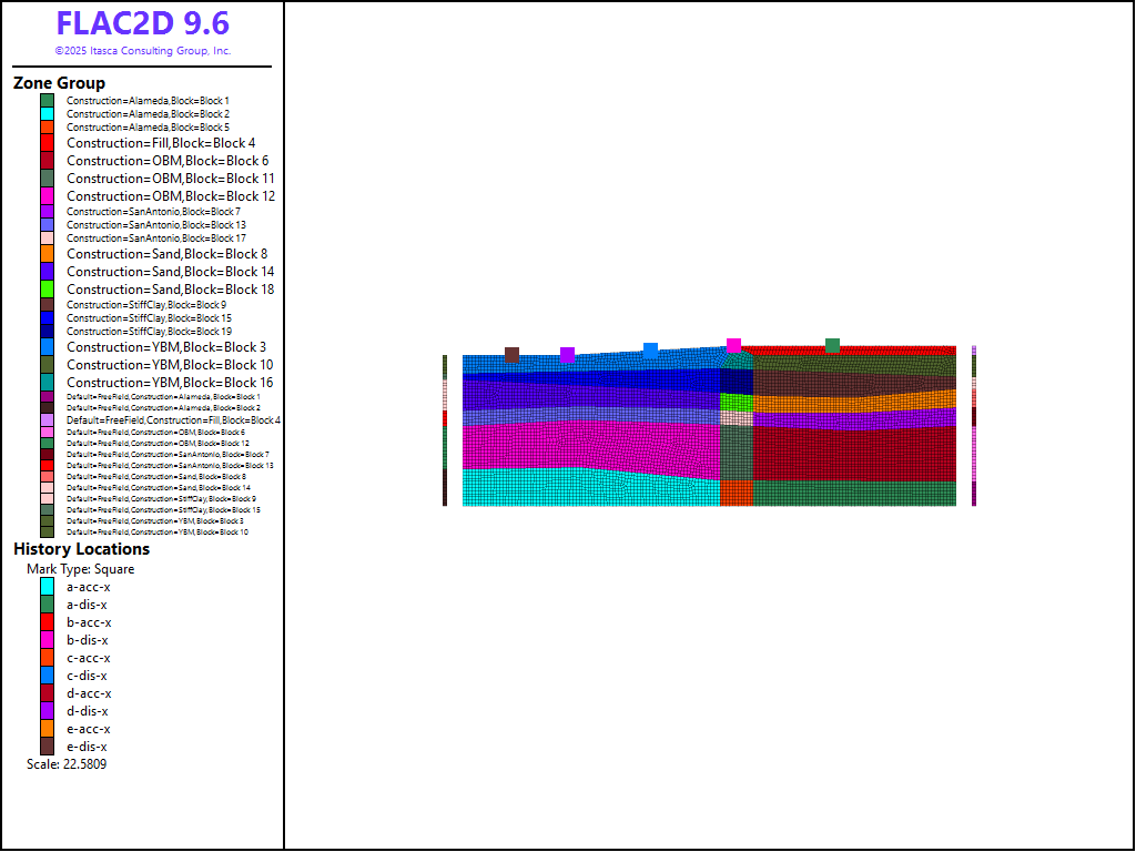 An illustrative model with a non-uniform soil profile under plane-strain conditions is performed for total stress site-response analysis. The 2-D soil profile and material groups are plotted in Figure 1. The soil profile base is at elevation -250 ft which is called the Alameda formation. From the base to the ground the soil layers are OBM, San Antonio, sand, stiff clay and YBM respectively. A fill layer with thickness of approximately 15 ft is at the ground surface at the right side. The lateral length of the soil profile is 800 ft. While the Alameda formation is modeled as elastic, all other materials are modeled with a Mohr-Coulomb model. The material properties are listed in Table 1. The natural frequency of the soil profile is approximately 0.56 Hz.