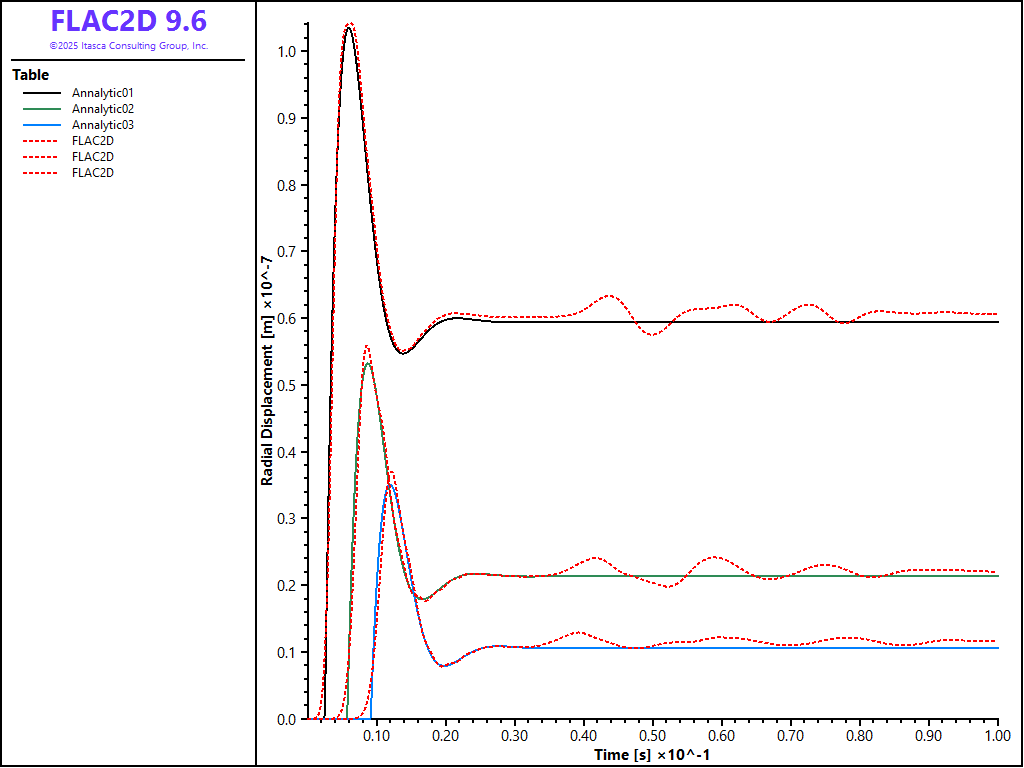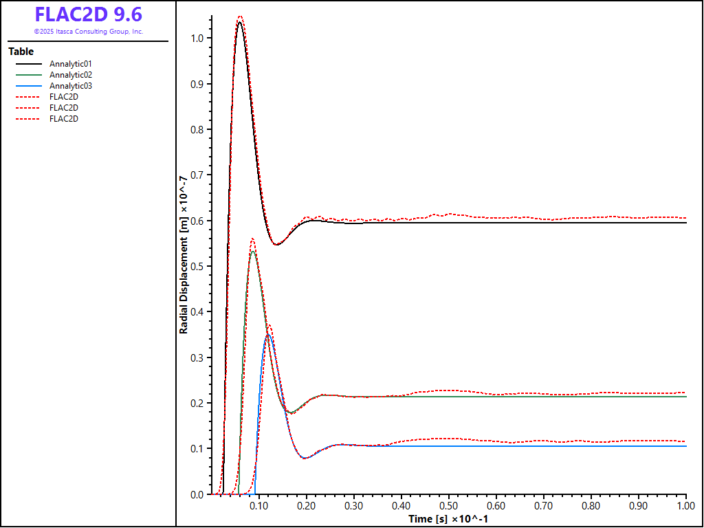 The radial displacement histories recorded up to 0.1 second at \(r\) = 2.05\(a\), 3.42\(a\), and 4.87\(a\) are given in Figures 3 and 4 for the circular and rectangular simulation, respectively. The delay of the response at locations far from the sphere can be noted in both cases. In both cases, FLAC2D is able to capture the response at peak and steady states. The fluctuation at late time is due to the fact that the radiated wave is not absorbed completely by the viscous boundary.