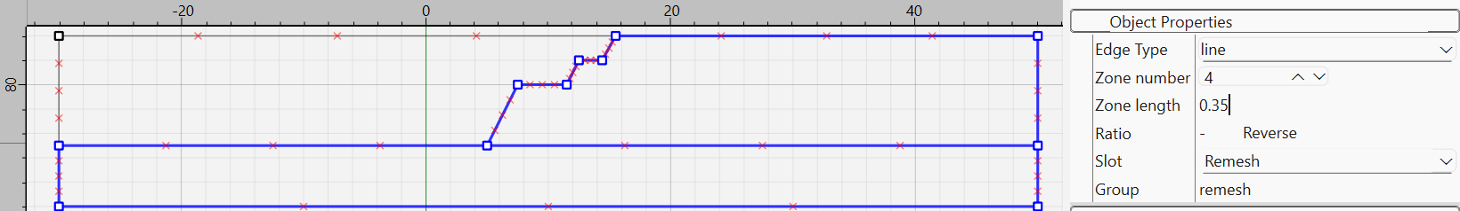 Next, select the edges forming the bench and the base and assign to them group “remesh” in slot “Remesh”. As this slot is not initially present, delete the name of any other slot from the edit box and type “Remesh”, then type group name. Also, set zone length to 0.35 m as shown in Figure 4. After this, deselect all edges and only select the remaining two edges at the top-left.[2] Set zone length to 0.35 m and do not assign any new groups or slots.