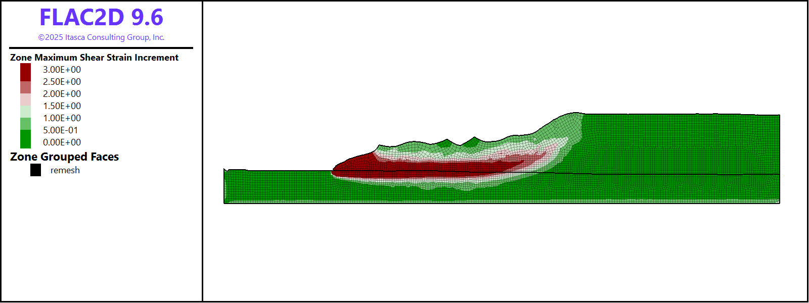 Note that the users may get somewhat different results final shape of the failed slope which is caused by three main reasons. First, the meshing process may produce equivalently valid but slightly different unstructured meshes at remeshing steps. Second interpolating numerous model parameters from the old mesh to a new one leads to data smoothing. And third, the strain-softening material properties depend on the accumulated shear strain and zone size, which makes the model sensitive to how often the geometry and mesh are updated. The overall slope failure, however, is consistent between model runs and the final failed slope shape is in the agreement with those observed in normal slope failure mechanism.