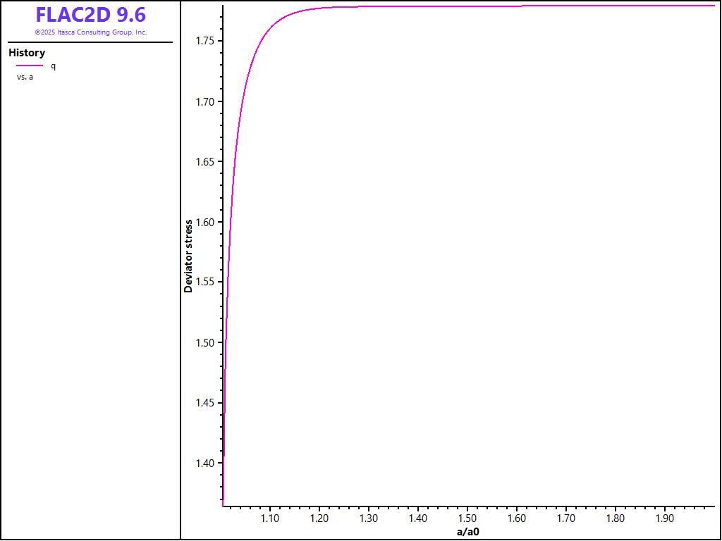 The evolution during the expansion of the deviator stress, \(q \big/ C_u\), at the cavity wall is plotted in Figure 3. The numerical results indicate a failure level at \(q \big/ C_u\) = 1.779. This value can be compared to the Cam-clay analytical prediction as follows. Under undrained conditions, the yield path followed by a normally consolidated stress point has the form (see the verification problem Drained and Undrained Triaxial Compression Test on a Cam-Clay Sample),