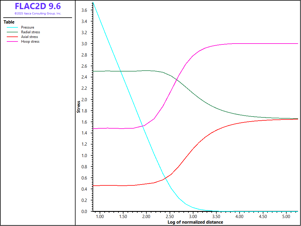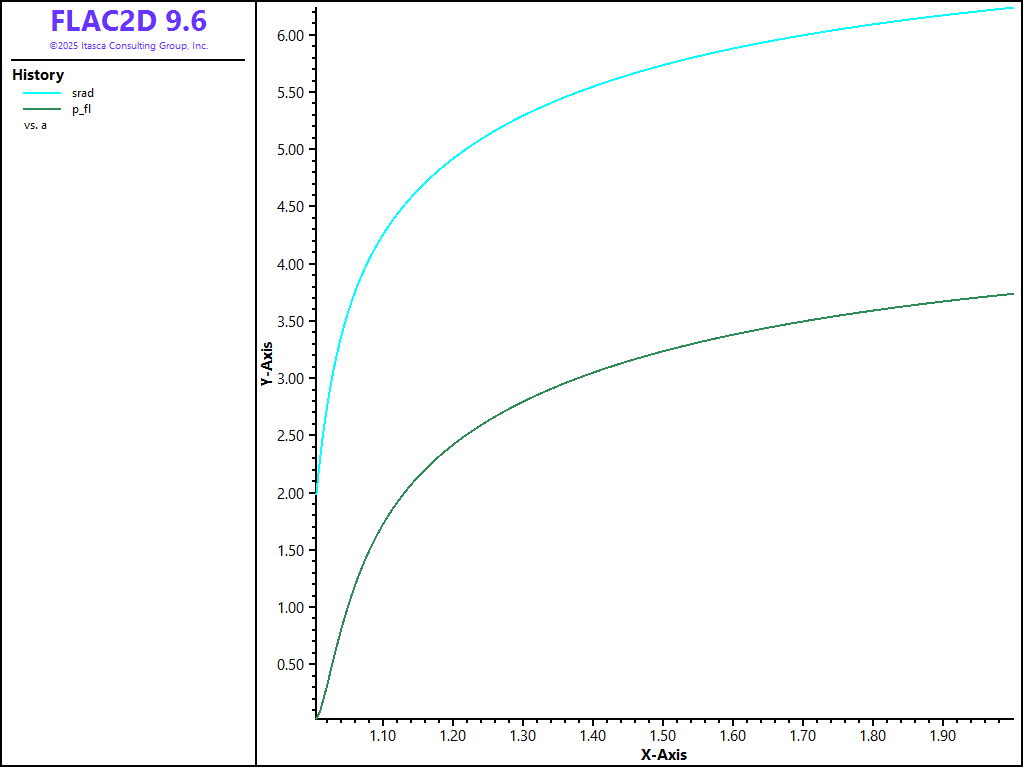 A compressive velocity of magnitude 10-5 is applied at the cavity boundary for a total of 100,000 steps, so that the cavity radius has doubled at the end of the pressure test. Stresses and pore pressure are monitored during the calculation.