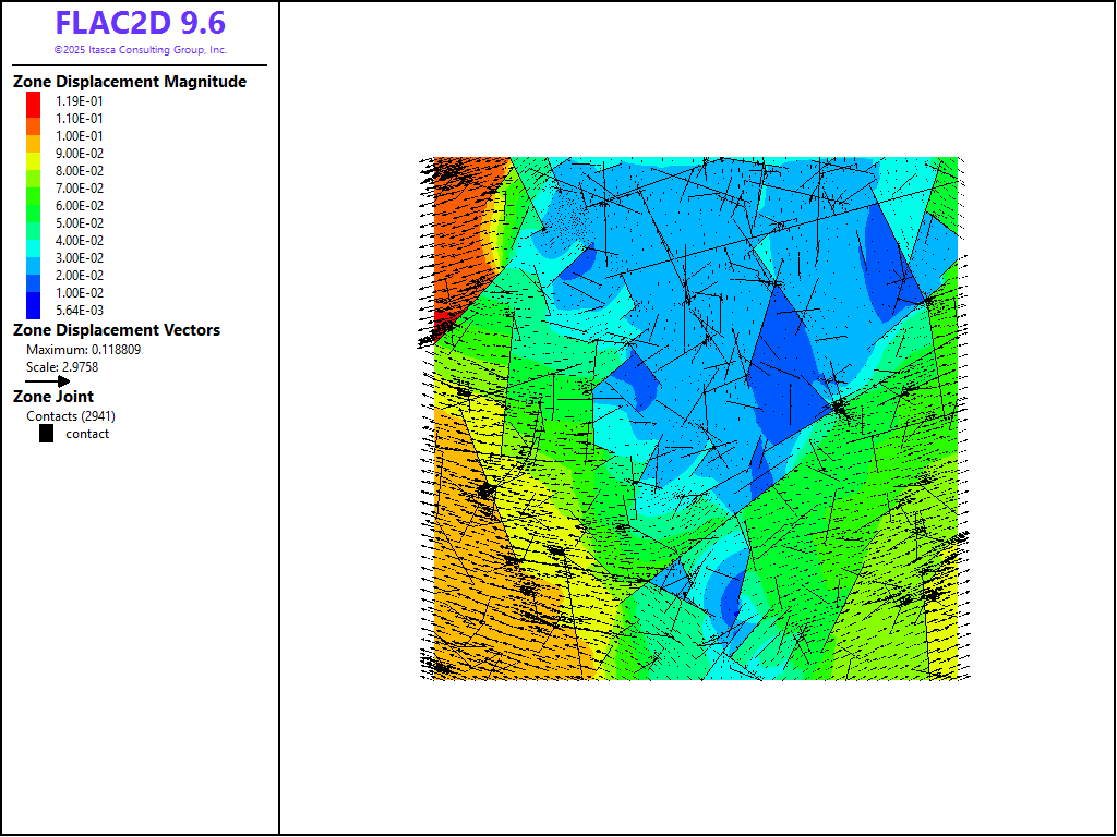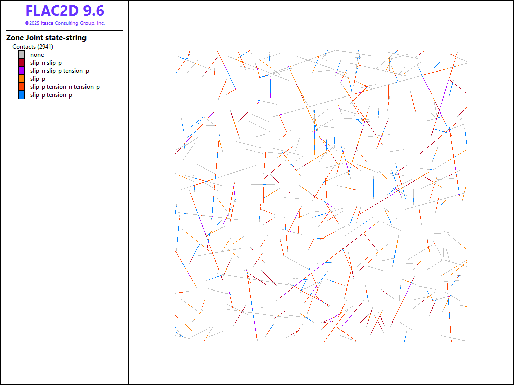 Specify rock and joint properties as in Table 1. Some FISH is now used to record the axial stress and strain as shown in ucs.dat. Finally, velocity boundary conditions are applied to the top and bottom of the sample to cause compression.