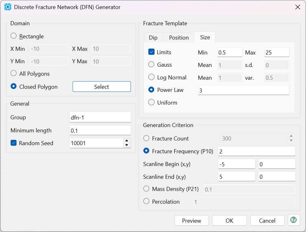 Fracture Frequency (P10)and enter a frequency of 2. Then for the Scanline Begin enter -5,0, and for Scanline End enter 5,0. The dialog should appear as shown.