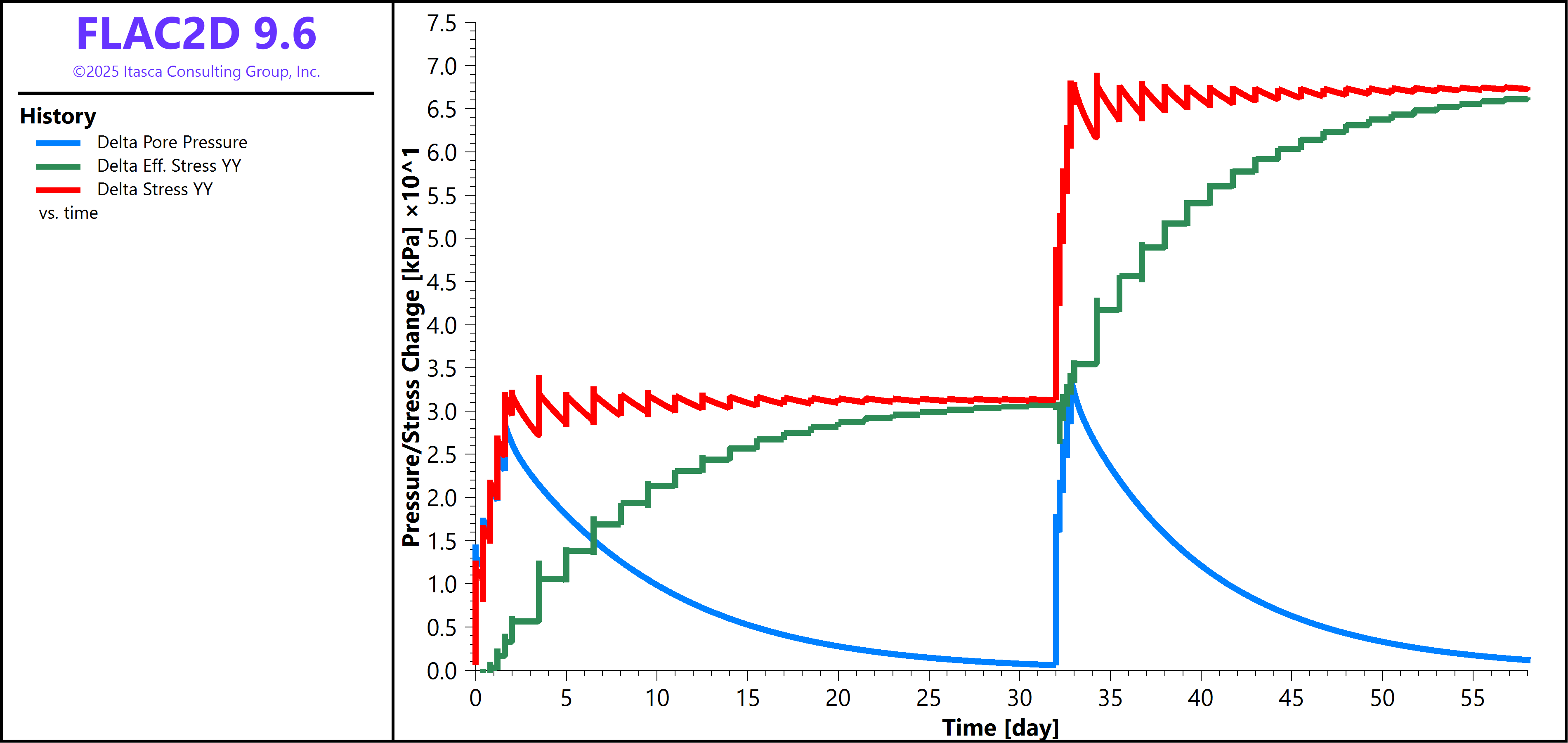 Figure 8 shows the total and effective vertical stress response during the construction periods (0-2 days, 32-33 days) and during the pressure dissipation periods (2-32 days, 33-58 days). The history location is at the center of the embankment and between the peat and clay layers. Total vertical stress remains constant during pore pressure dissipation periods while effective stress increases. Note that the figure below utilizes geomechanics sign convention for total and effective horizontal stress (compressive stress changes positive) in order to visualize together with pore pressure.