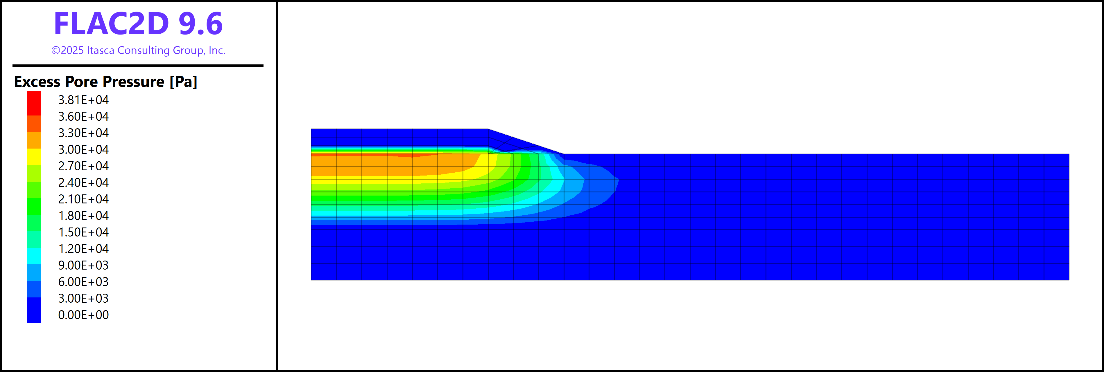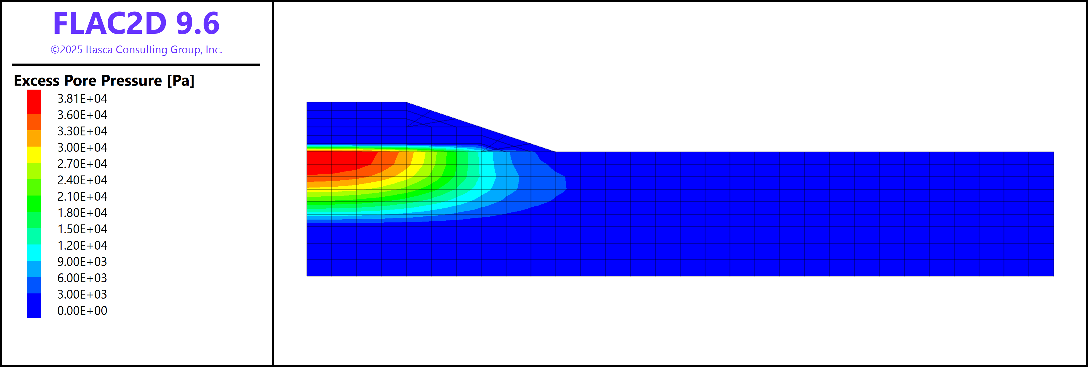 Excess pore pressure calculation (current pressure minus initial hydrostatic pressure) is described in the example Embankment Consolidation (Mohr-Coulomb) (FLAC2D); refer there for a complete description. The excess pore pressure distribution immediately after construction of each embankment lift is shown below. Note that 30 days of pore pressure dissipation occurs between Figure 6 and Figure 7.