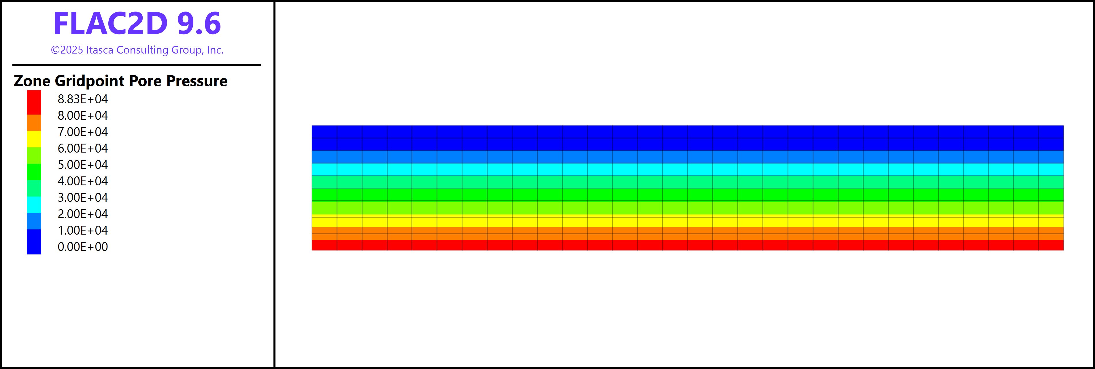 zone fluid modulus-automatic. (This assumes the fluid is essentially incompressible relative to the soil and therefore sets the fluid modulus to be 20× stiffer than the soil stiffness). Note that the biot modulus is set to 0 before executing this command because the automatically-calculated modulus will not be used if the existing modulus is lower (and non-zero).Pore pressure generation is activated in the soil layers with