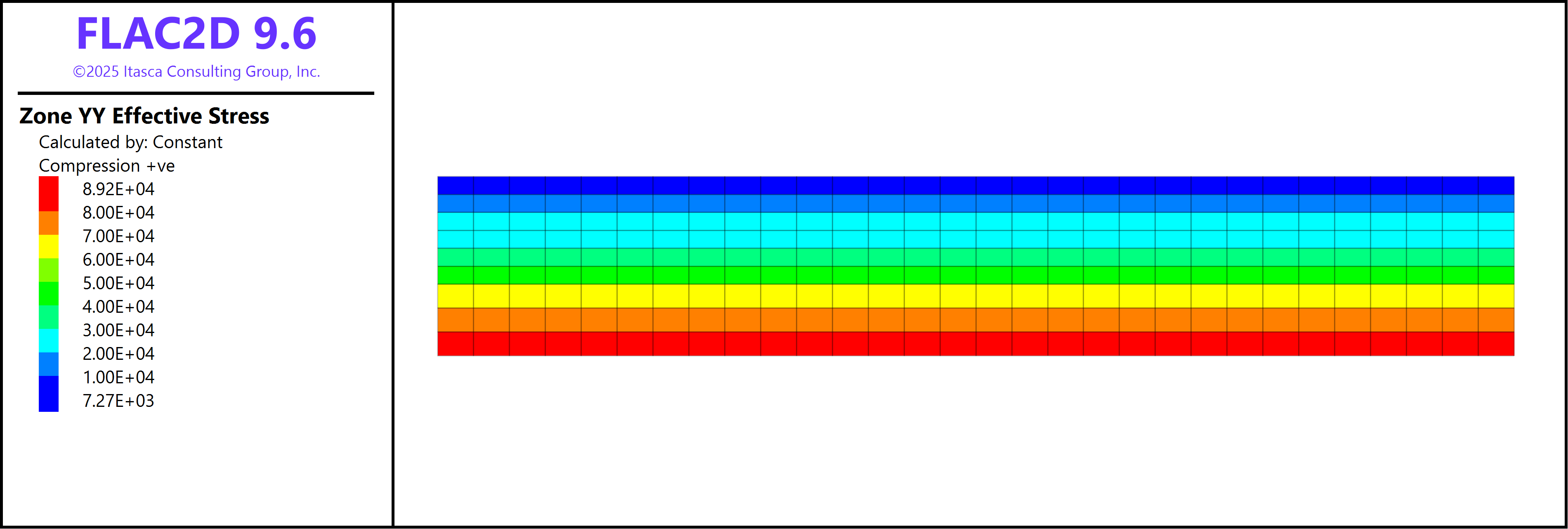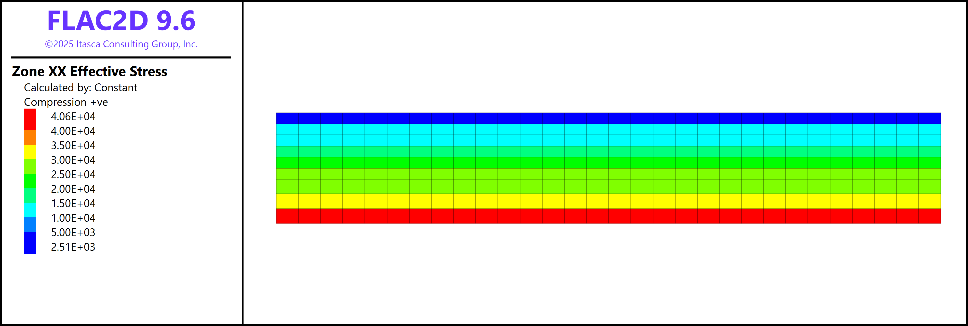 The first step in the model is to initialize the in-situ stresses, pore pressures, and the volumetric yield surface for the soft-soil layers. This is accomplished by first setting the nonlinear materials to a Mohr-Coulomb constitutive model, applying a hydrostatic pore pressure gradient with zone gridpoint initialize head, initializing the horizontal effective stresses (both in and out of plane in 2D) to K0 conditions with zone initialize-stresses ratio, and solving to static equilibrium. Once the in-situ stresses are initialized, the constitutive models are switched to nonlinear and the model is solved once again to static equilibrium. The in-situ state is shown on Figure 2 to Figure 5.