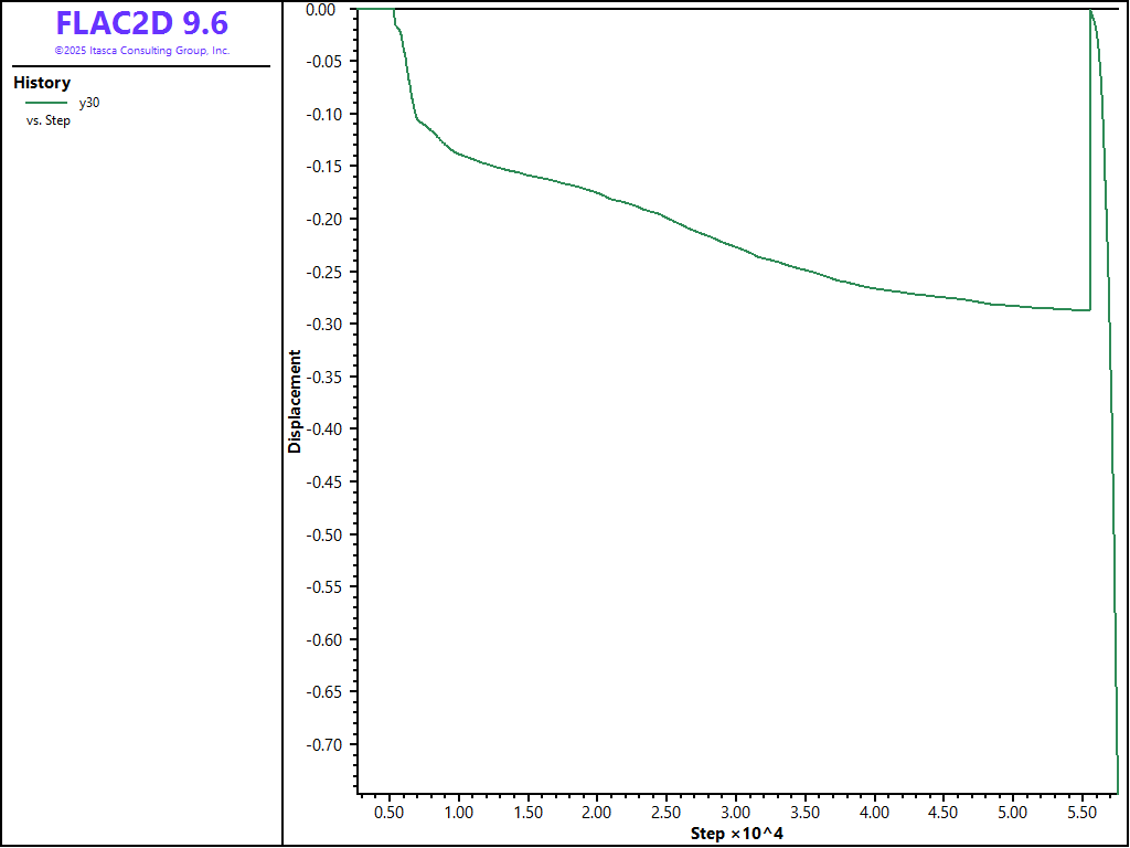 The modeling sequence is as follows. First, the gravity stresses are allowed to develop in the sandfill, and forces equilibrate across the interface. This is done elastically so that the fill will not yield. At equilibrium, displacements are reset, cohesion is set to the proper value, and vertical retreat mining is simulated by removing the \(x\)-direction fix along the left-face boundary in small increments that simulate the blast height (6 m). The \(x\)-displacement history is used to evaluate whether the system is coming to equilibrium at each step. Excavation is continued until active collapse of the pillar occurs.