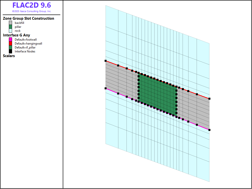 Interfaces are placed between the pillar and the hangingwall, and between the pillar and the footwall, to simulate the sliding contacts. The interfaces in FLAC2D are one sided, and it is best to attach the interfaces to the smaller surface. In this case be sure to attach the interface to the top and bottom of the pillar - not the hangingwall and footwall. To make the interfaces in this way, follow these steps in the Model workspace: