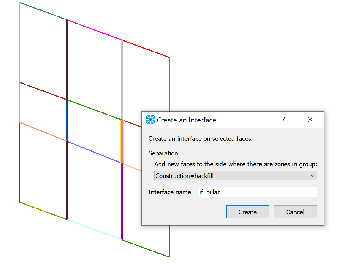 Select the vertical face on the right side of the pillar. Select Create an interface from the drop-down menu on the tool bar. Choose Construction=backfill for the new faces and name the interface if_pillar (Figure 3).