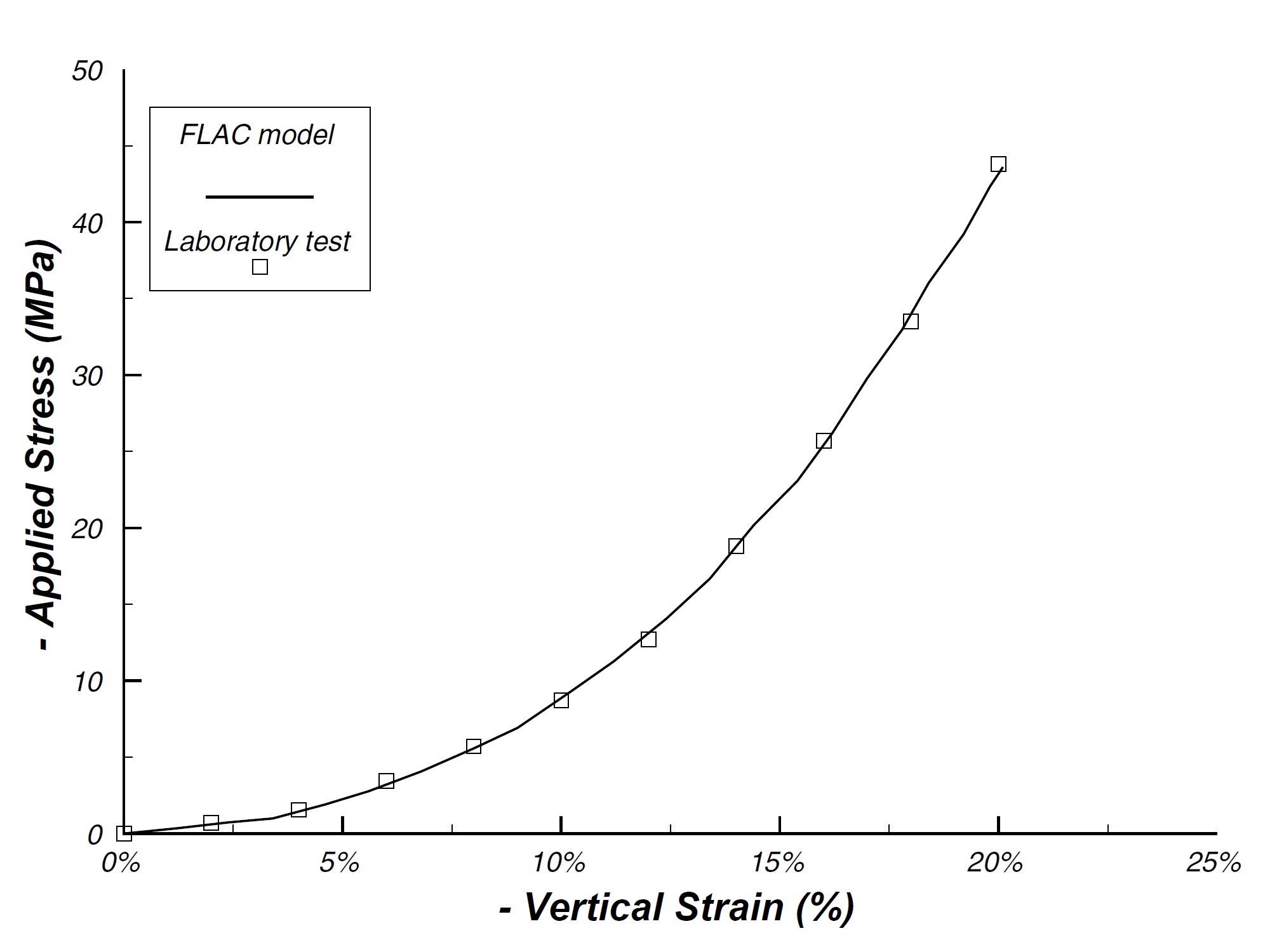 Figure 4: Comparison of experimental and FLAC-modeled uniaxial strain test (Clark, 1991).