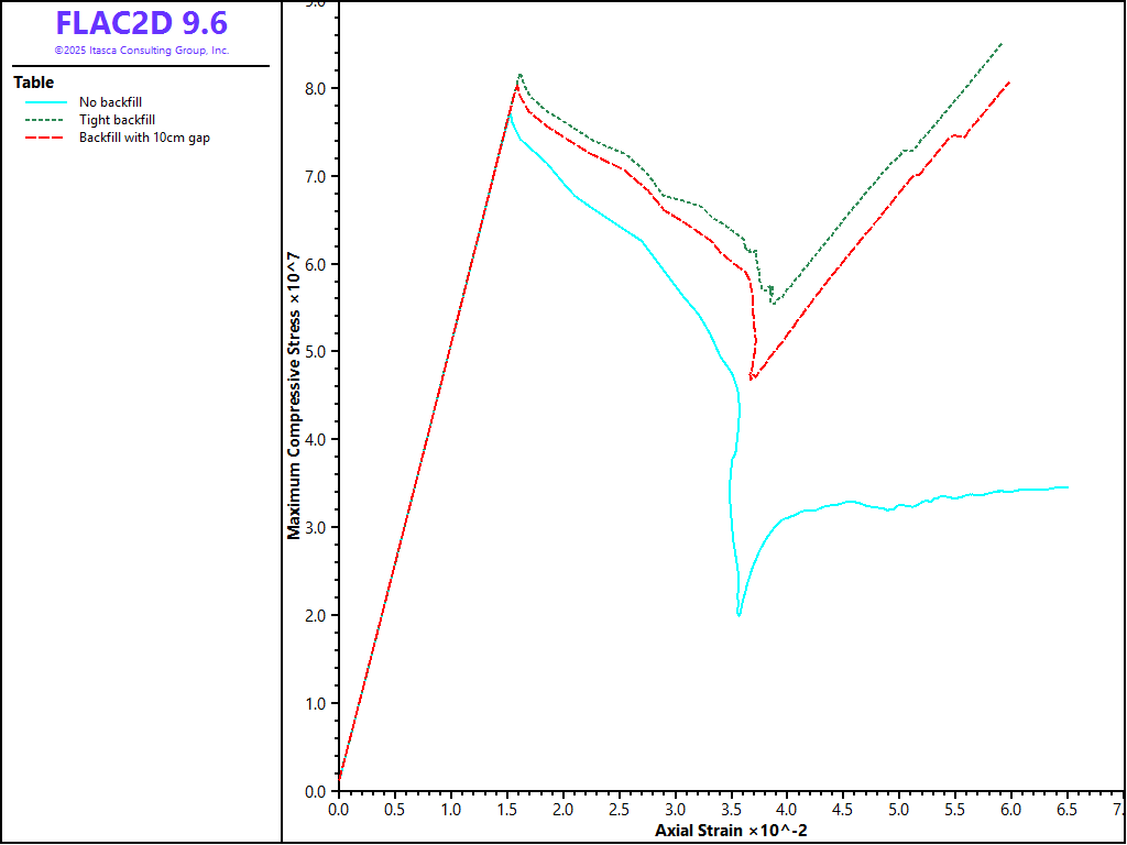 The vertical-stress versus the vertical-strain (both measured in the pillar) results are plotted for the three cases in Figure 8. The backfill has little effect on the peak strength, but it has a significant effect on the post-peak behavior due to an increase in confining stress. When backfill is present, the average pillar stress does not drop below 45 MPa, as opposed to a residual average stress of approximately 35 MPa with no backfill present. An expected delay in stress buildup in the pillar occurs for the case that includes a gap between roof and backfill.