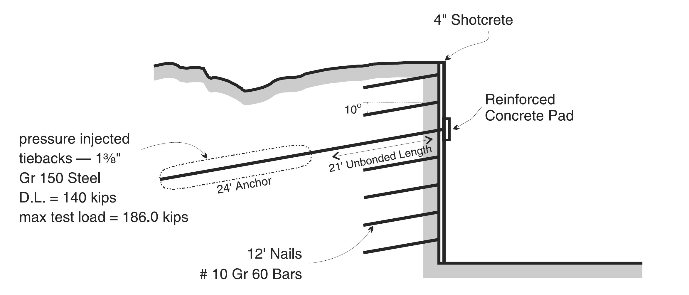 A test wall is constructed in well-graded sand and supported by shotcrete, tiebacks and “soil nails” (ASCE 1988). The “nails” consist of No. 10 grade-60 steel bars grouted into the soil mass. The tiebacks are anchored over a 24-foot length by pressure grouting and are pretensioned at a lockoff load of 186.0 kips. A cross-section through the test wall is shown in Figure 1.