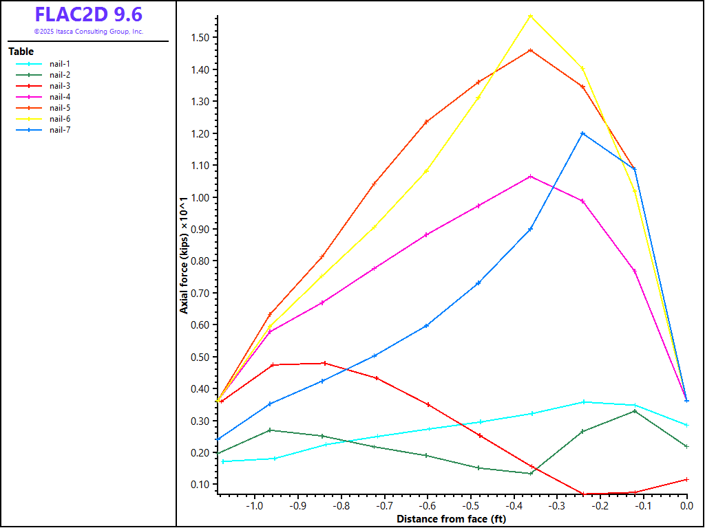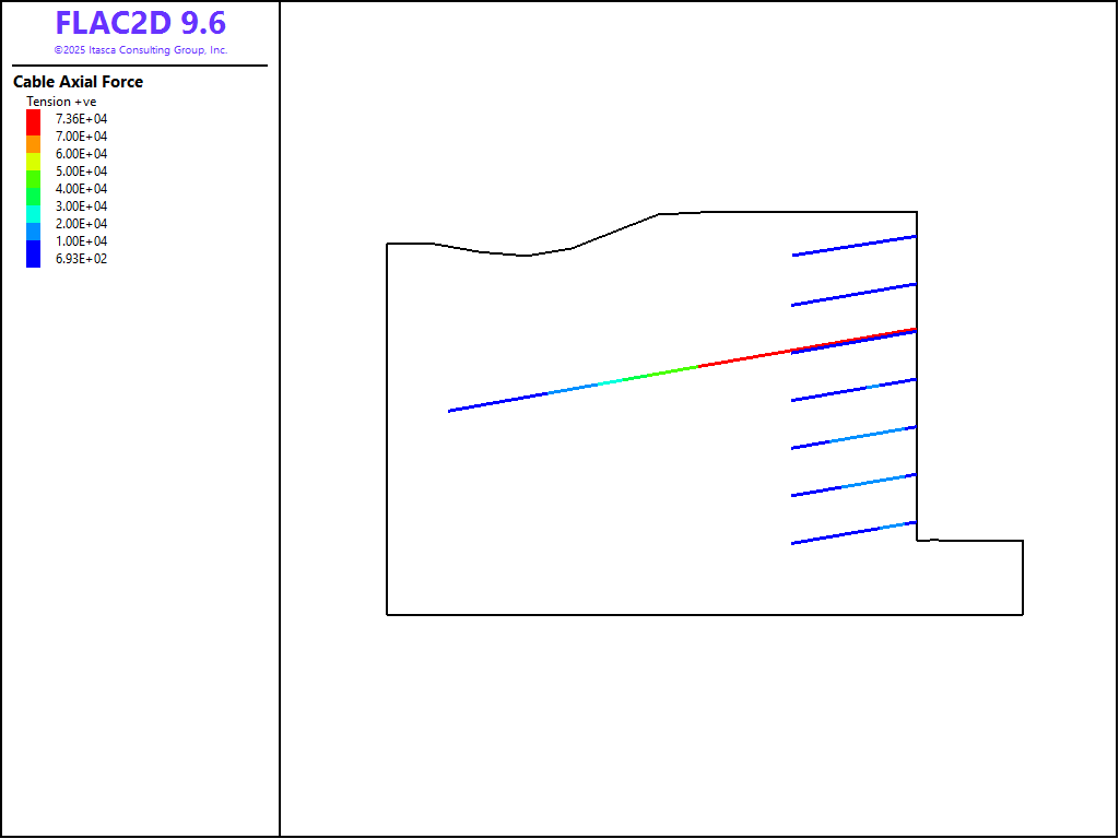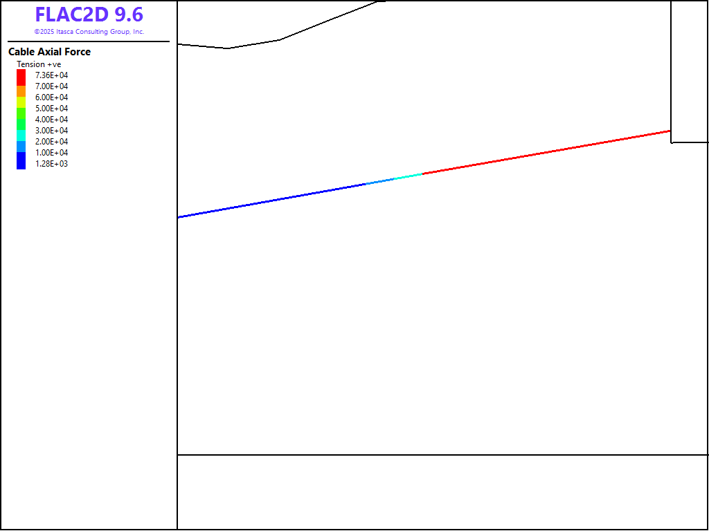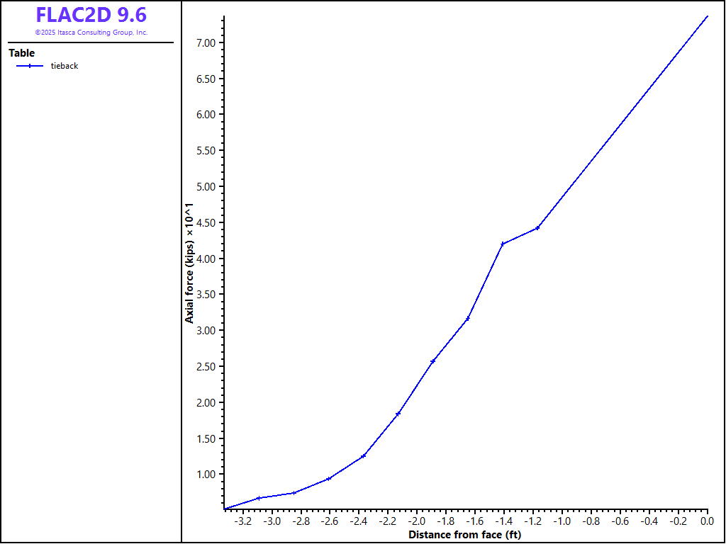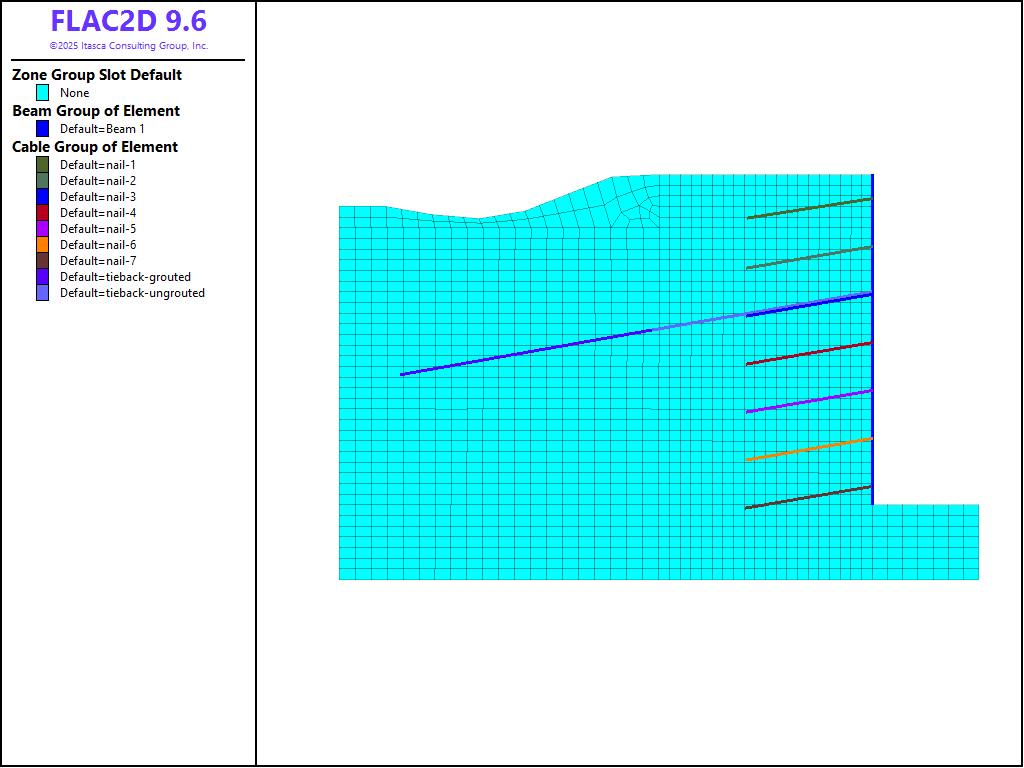 The pressure dependency of the grout bond strength for the soil nails and tiebacks is neglected for this analysis. See Simulation of Pull-Tests for Fully Bonded Rock Reinforcement (FLAC2D) for an example that includes the pressure dependency of the bond strength.