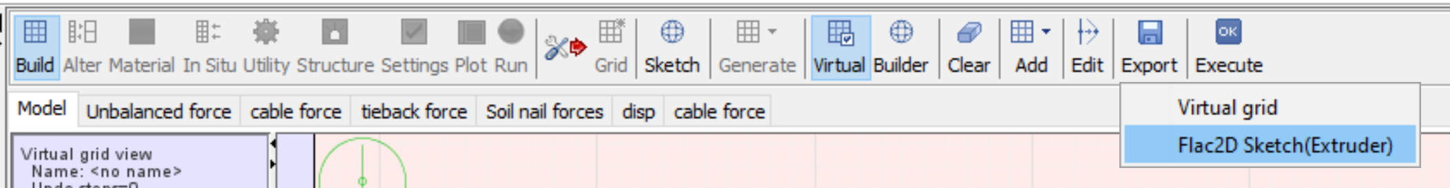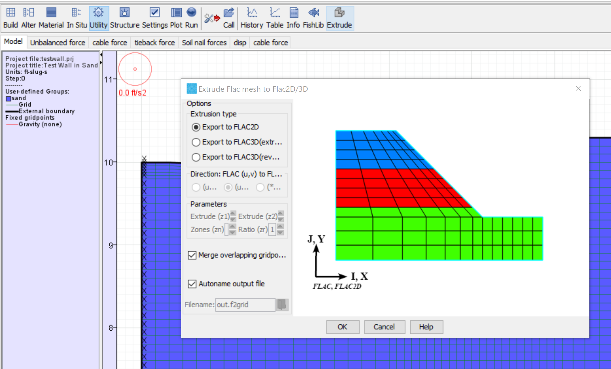 Export the virtual grid from Example 06 in FLAC 8.1. This will produce a data file that can be opened and called in FLAC2D. Calling the data file generates a Sketch set with the complete mesh and groups, and also automatically creates the zones. An example is included with the project called