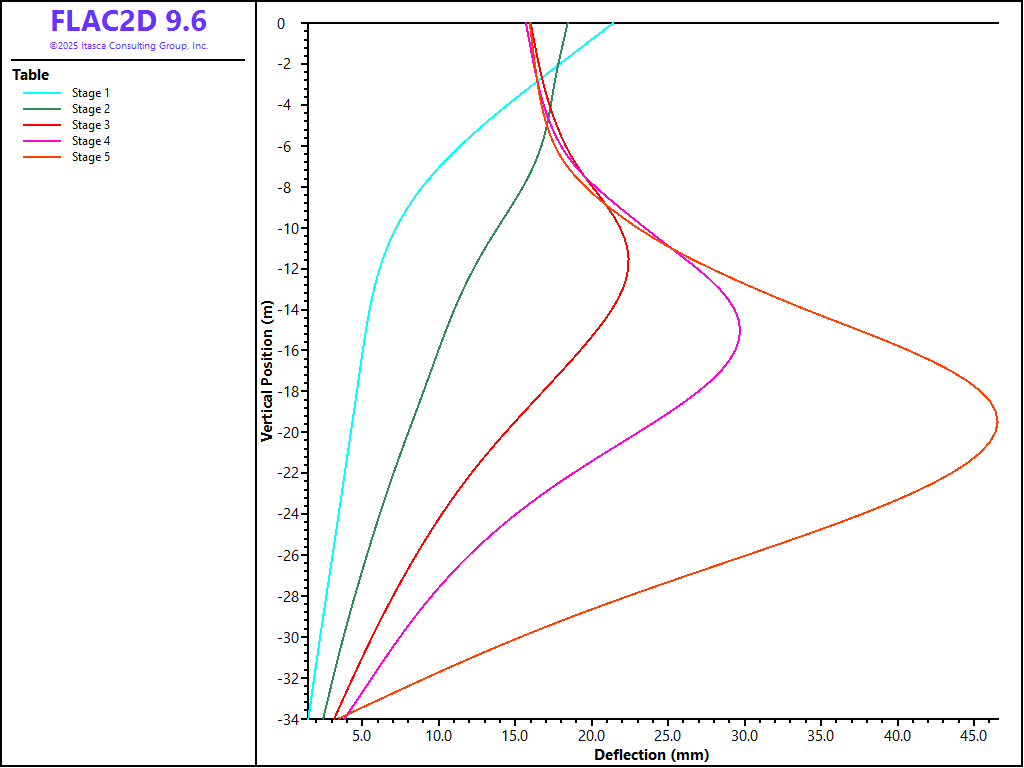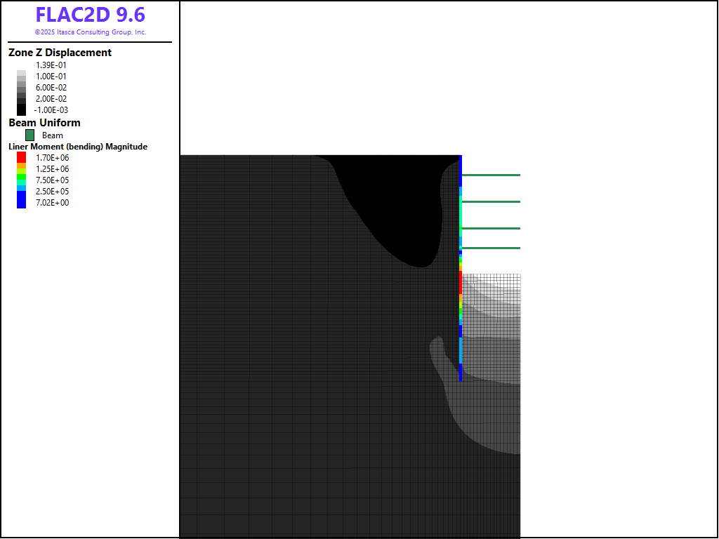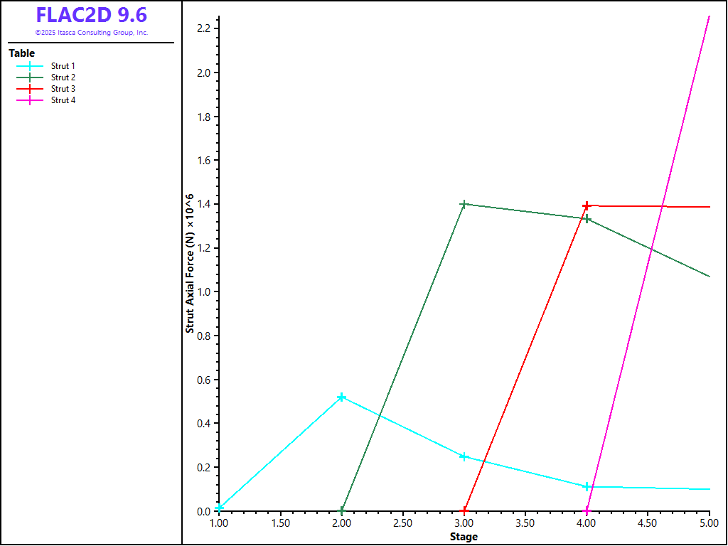 The various stages of construction of a diaphragm wall can be simulated with FLAC2D. This example models the stages following the construction of the panels. Dewatering, excavation, and installation of struts are simulated in five excavation stages.