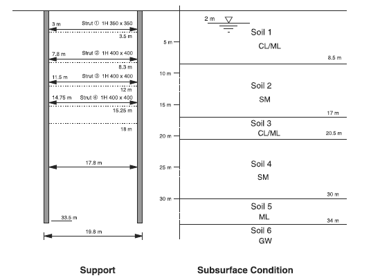 A thick aquifer of dense gravel is located below a depth of 34 meters. The pore pressure is assumed to be a constant value of 317 kPa at the bottom of the diaphragm wall. The wall is 1 meter thick and is assumed to behave as an elastic material with a Young’s modulus of 19.2 GPa and Poisson’s ratio of 0.2. The struts are spaced at 2-meter intervals and are preloaded. The excavation and dewatering depths are listed in Table 2. The locations and properties of the struts are summarized in Table 3. The Young’s modulus for the struts is 200 GPa.