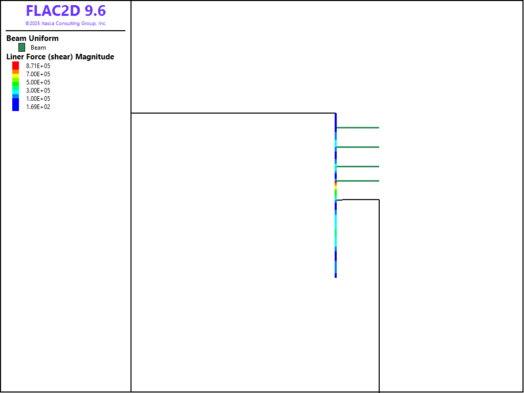 Of interest in this analysis are the distribution of shear force and bending moment in the wall, the axial force in the struts, and the displacements of the soil behind the wall.