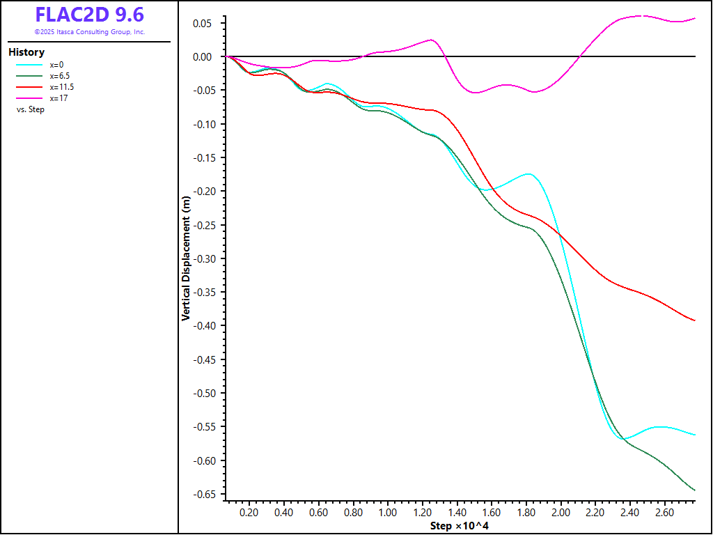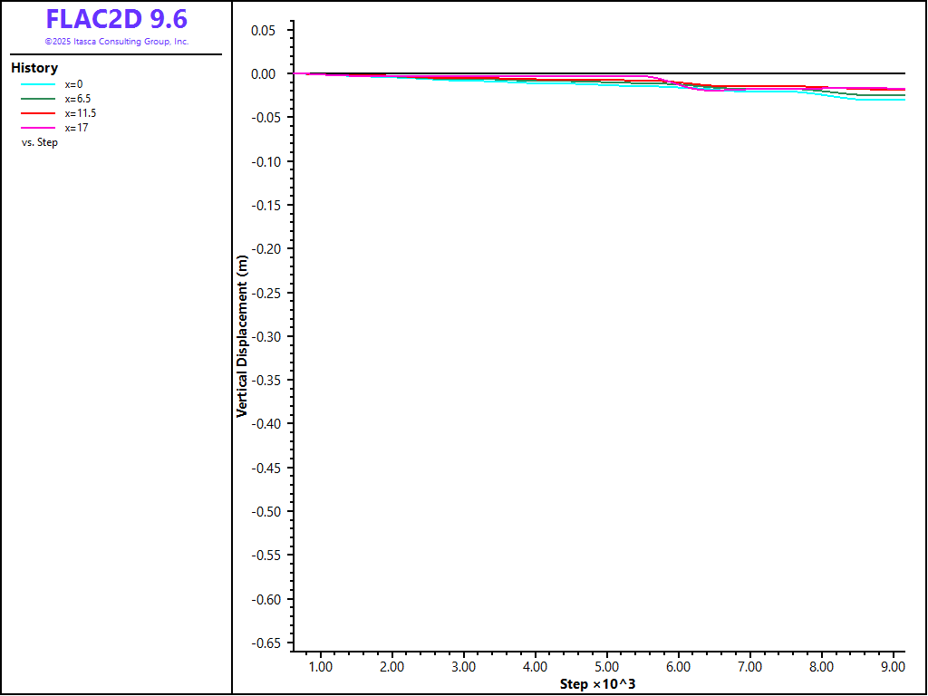 Vertical displacement histories are recorded at four locations along the base of the embankment at (\(x\) = 0,\(y\) = 0), (\(x\) = 6.5,`y` = 0), (\(x\) = 11.5,\(y\) = 0) and (\(x\) = 17,\(y\) = 0). The displacements are monitored throughout the embankment construction; the results are shown in Figure 6. The extent of the displacements induced by the unsupported construction is shown in Figure 7. The maximum vertical displacement beneath the embankment is approximately 0.7 m (2.3 ft).