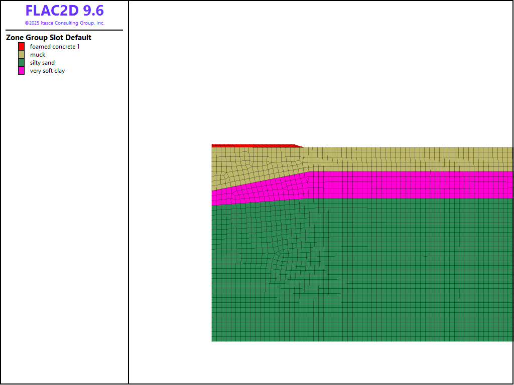 The unsupported embankment construction is simulated by adding each embankment-lift group individually by setting its constitutive model to Mohr-Coulomb, setting its properties and then solving for the equilibrium state with this lift in place. Note that the fluid properties are not required since a fluid flow analysis is not being performed (by default, porosity is 0.5). As each group is added, the saturation values of the gridpoints in the group are set to zero to simulate the unsaturated condition of the embankment materials. Figure 5 shows the model after adding the first lift. These steps are repeated for each of the three remaining foamed concrete lifts and the earth-fill lift. Finally, the traffic surcharge is applied along the top of the embankment. Each of the unsupported construction stages is saved as a separate save state.