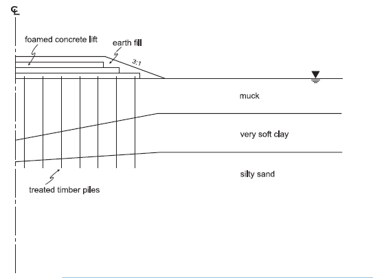 Figure 1: Half-section view of foamed concrete embankment on timber piles.