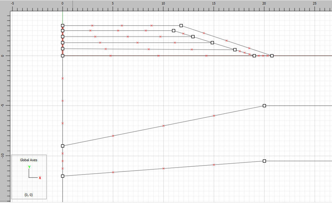 Now draw horizontal lines from the left side to the edge of the earth fill at \(y\) = 0.7, \(y\) = 1.3, and \(y\) = 1.9. It can be easiest to do this by drawing the lines past the edge of the fill and then deleting the dangling points. The top-left part of the the model should appear as shown below.