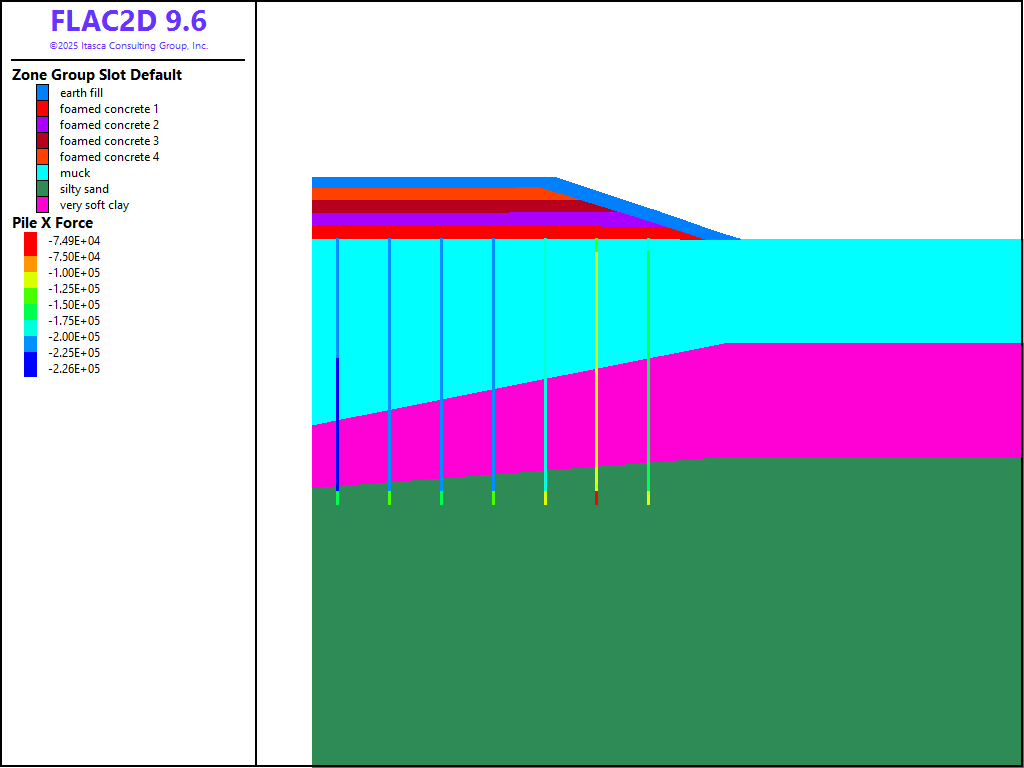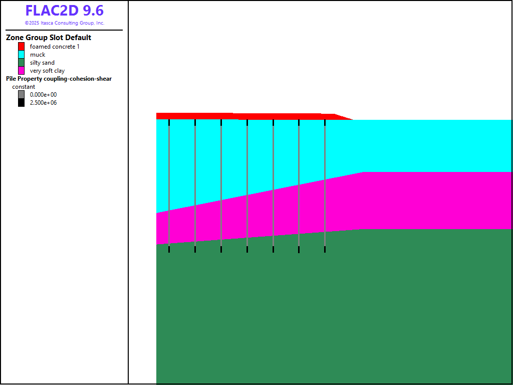 This example presents a FLAC2D analysis of the initial (undrained) construction stage for a highway embankment built over soft, saturated foundation clay and muck, using timber piles to support the embankment [2]. The piles extend through the soft materials and into underlying silty sands. The embankment includes foamed concrete engineered fill as part of the embankment materials. The lightweight foamed concrete is placed in lifts of approximately 0.6 m thickness. The first lift is placed over a wire mesh directly in contact with the top of the timber piles. Earth fill and pavement material are placed as cover over the foamed concrete. The analysis also includes a traffic surcharge of 11,500 Pa (240 psf). Figure 1 shows a section view of the embankment and foundation materials. The groundwater surface is at the top of the foundation materials.