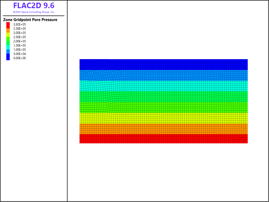 Also, because large deformations during the embankment construction are anticipated, the calculations are peformed in large-strain mode. The pore pressures after solving for the initial state are shown in Figure 4.