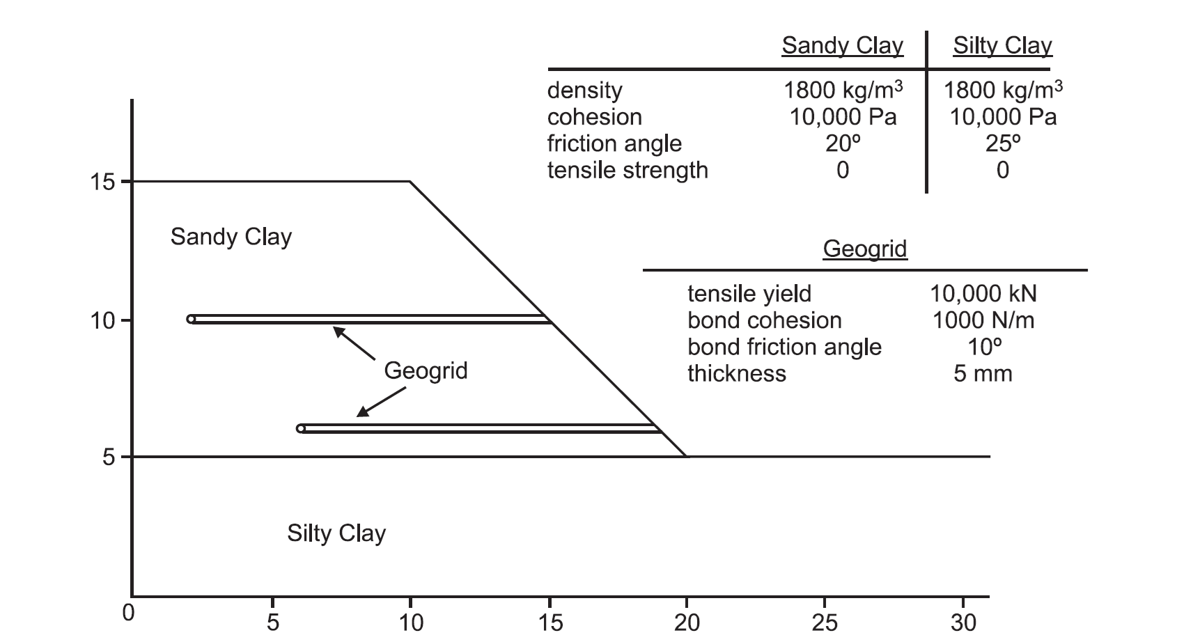 In this example, two layers of geogrid are used to stabilize a slope. The slope conditions and material properties for this model are shown in Figure 1.