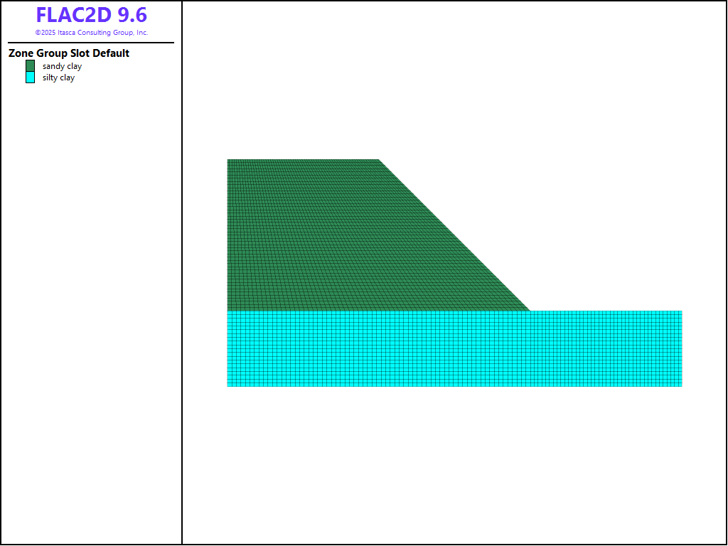 This model is saved. Data files are then used to restore this saved state, assign properties and boundary conditions, add reinforcement and run the factor of safety analyses (see data files). Note that in 2D, geogrid reinforcement can be simulated with cables.