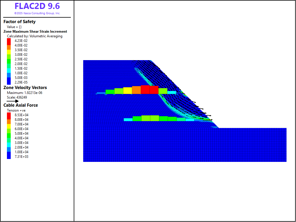Note that in FLAC2D, the structural element strength properties are not reduced during a factor-of-safety analysis. The factor-of-safety calculation results are shown in Figure 5. The safety factor is now increased to 1.07.