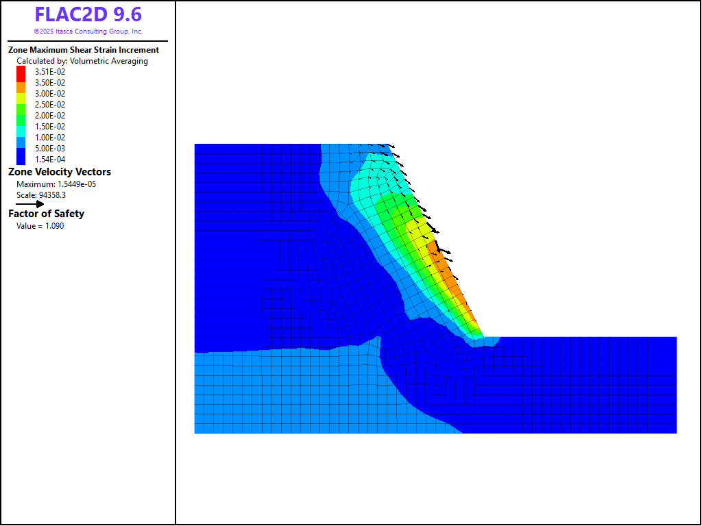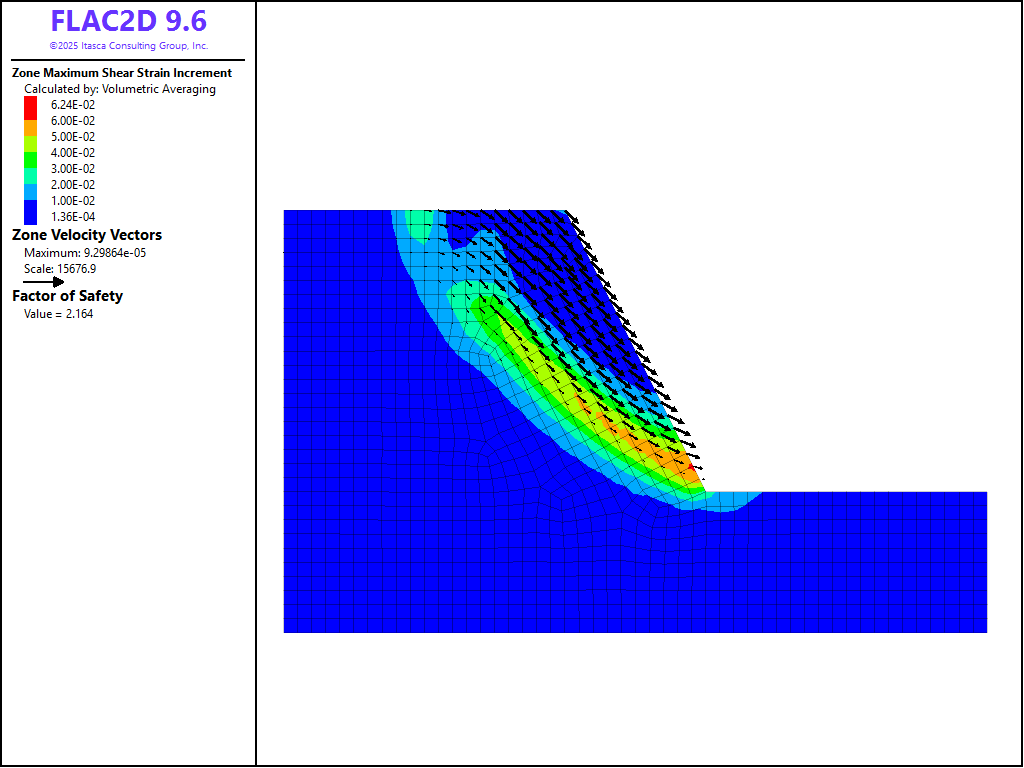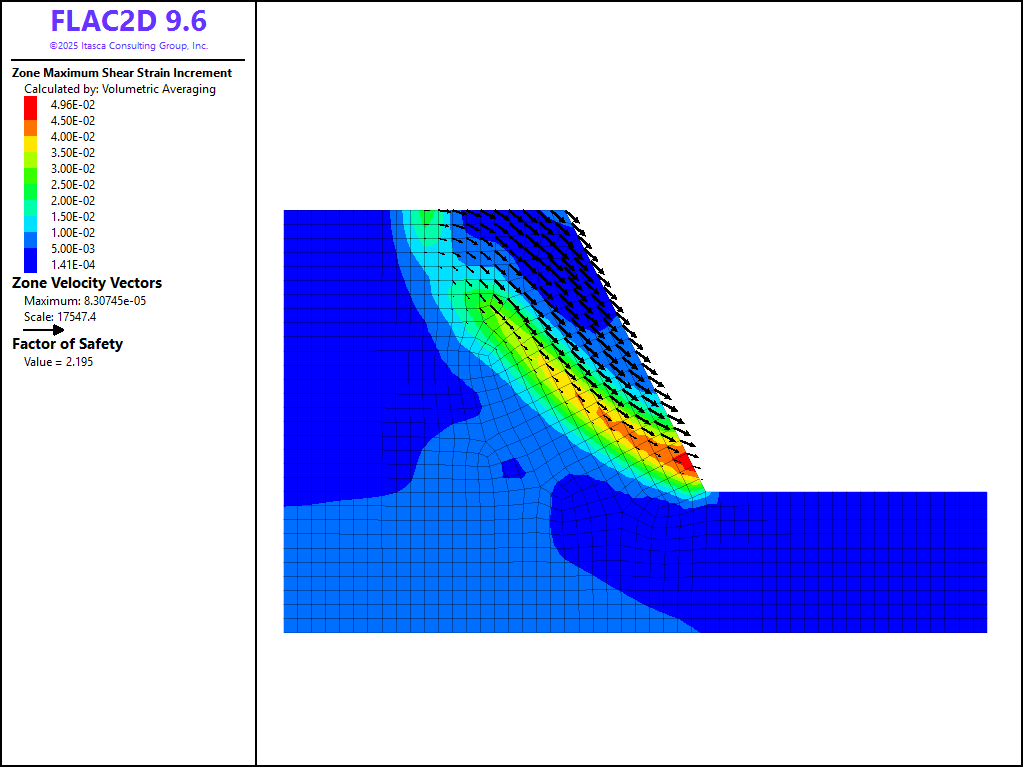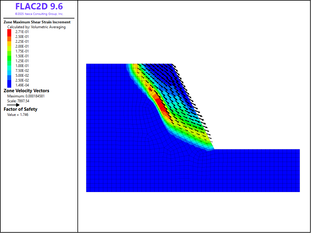 Figure 3: Factor-of-safety plot for rock slope neglecting the presence of jointing – velocity vectors and shear strain contours.