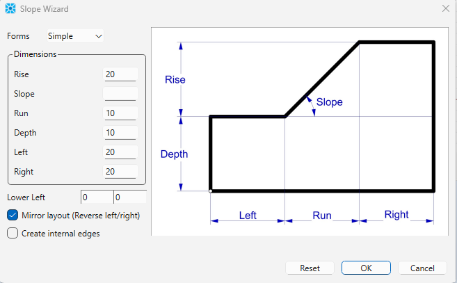 The model geometry is created using Sketch. After creating a new Sketch set, open the Slope Wizard and enter the following parameters:
