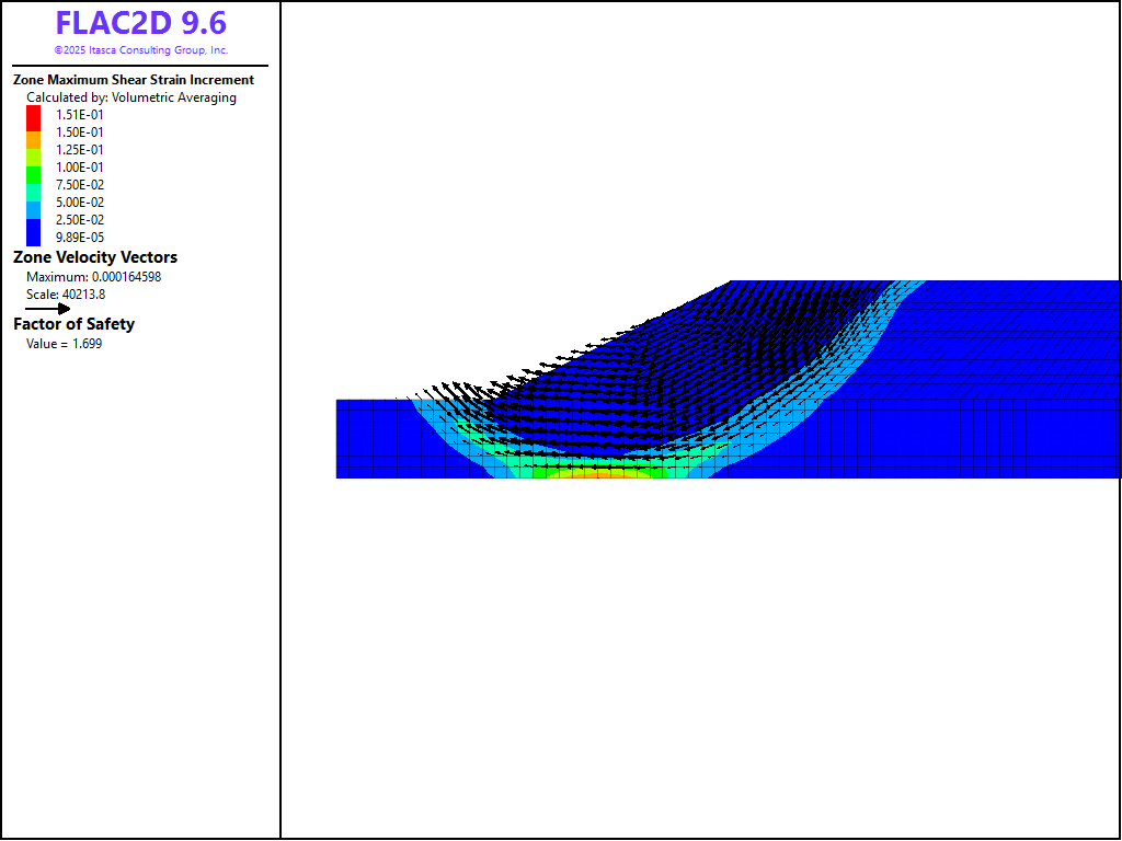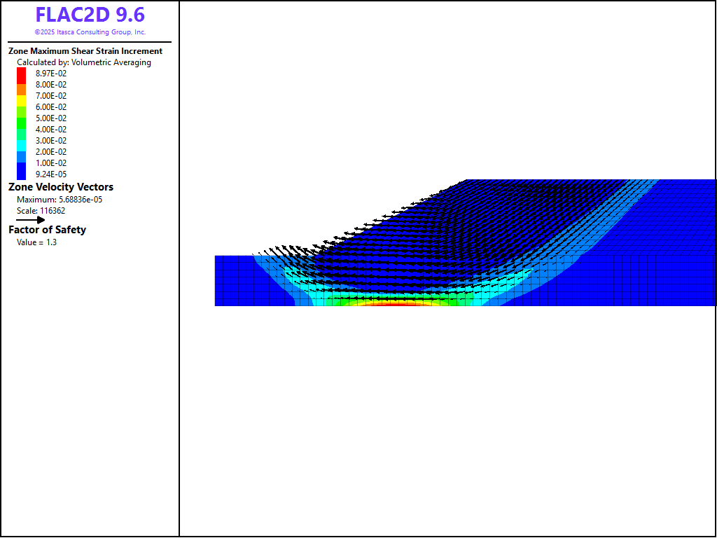The factor of safety calculated from the pseudostatic FLAC2D run is 1.25. A circular failure mode is indicated in Figure 4. The results compare well with the pseudostatic limit equilibrium solution. The static factor-of-safety is also calculated to be 1.69, and the failure surface result is shown in Figure 5.