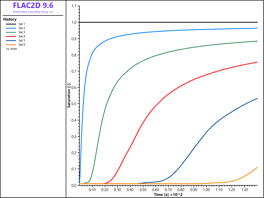 Figure 1 shows the evolution of saturation at monitoring points indicated in Figure 2 for the first 140 seconds after the caisson is placed in contact with water. It is clear that 140 seconds is enough time for the saturation front to reach all monitoring points. Contours of saturation at the end of the infiltration period are shown in Figure 2. Lastly, the partially-saturated fluid compressibility (inverse of Biot modulus) is shown in Figure 3.