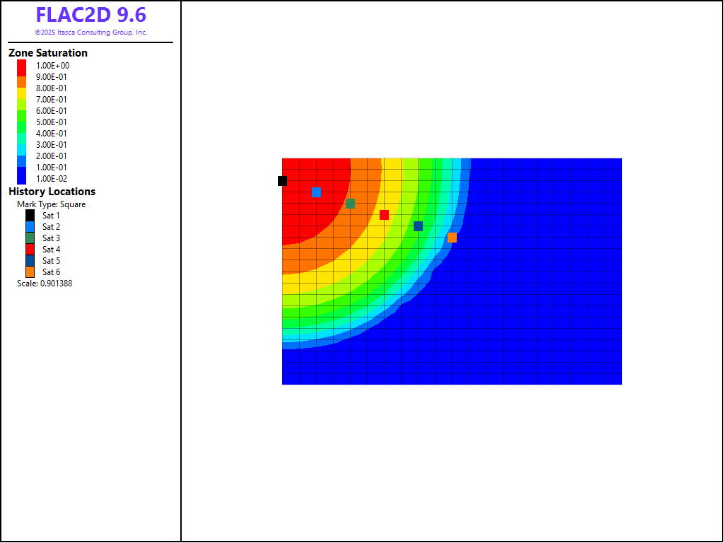 Figure 2: Saturation contours and history monitoring points at the end of the infiltration period.