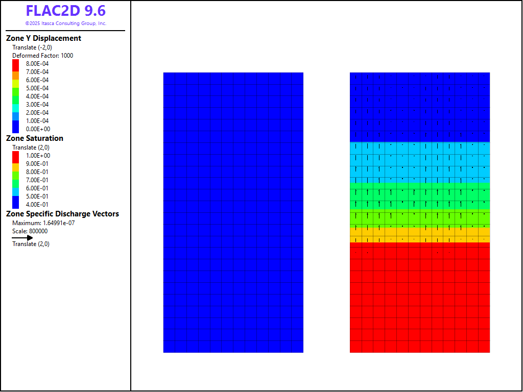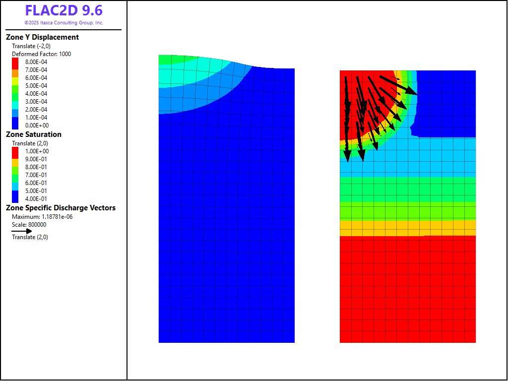 Figure 1: Deformation and saturation contours at time \(t\) = 0 days.