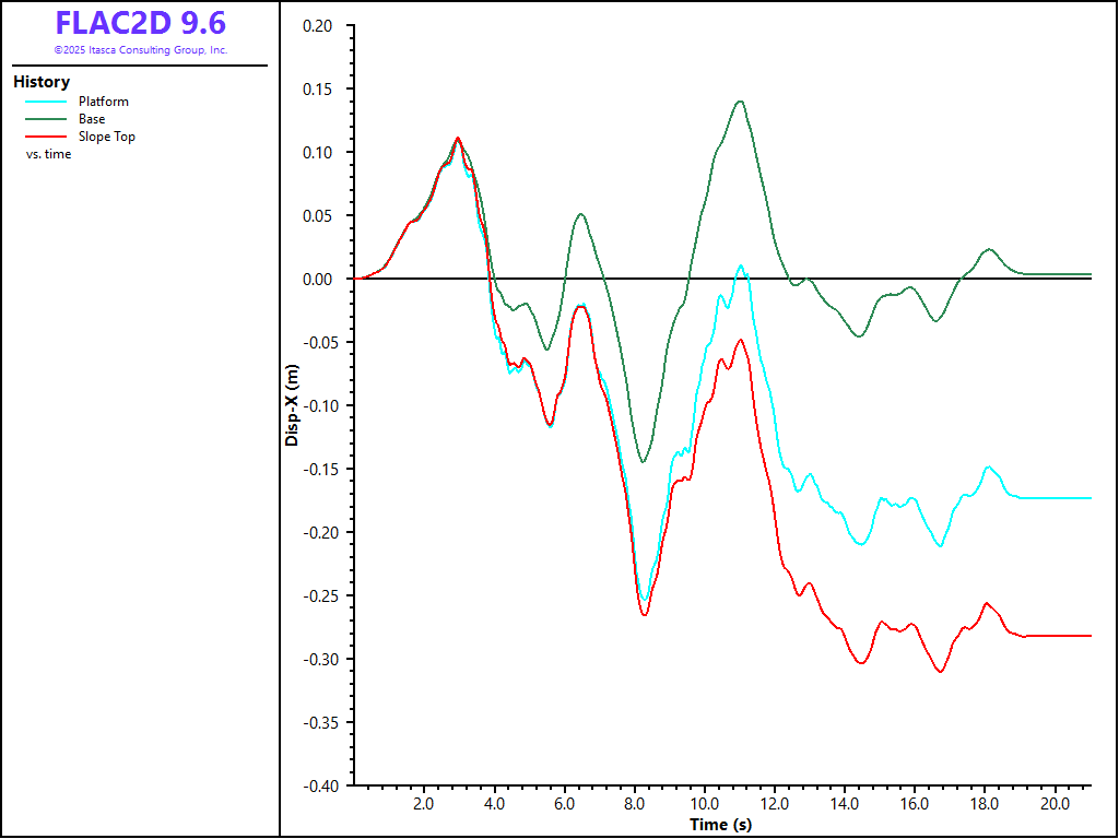 Similar results for sand \(D_r\) = 0.75 (75%) are plotted in Figure 11 to Figure 13. Excess pore-pressure builds-up are observed in Figure 11. Lateral displacements of platform and slope shown in Figure 13 are less than those in Figure 10, which is apparently due to the sand in Figure 13 being denser.
