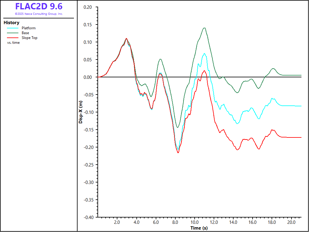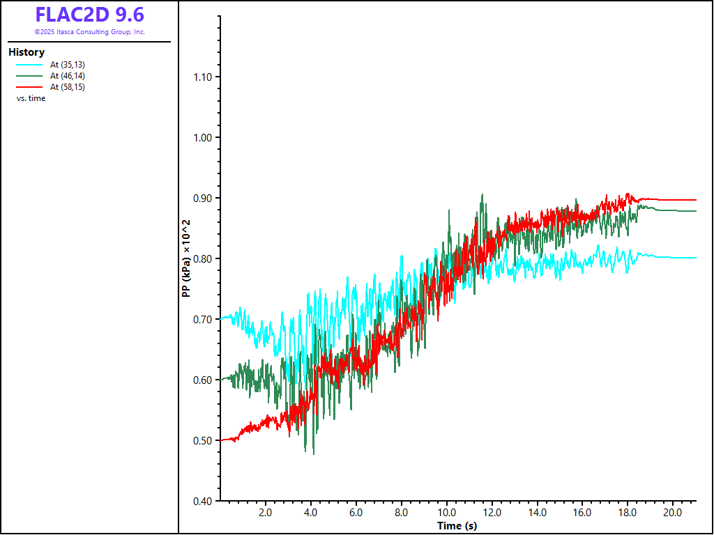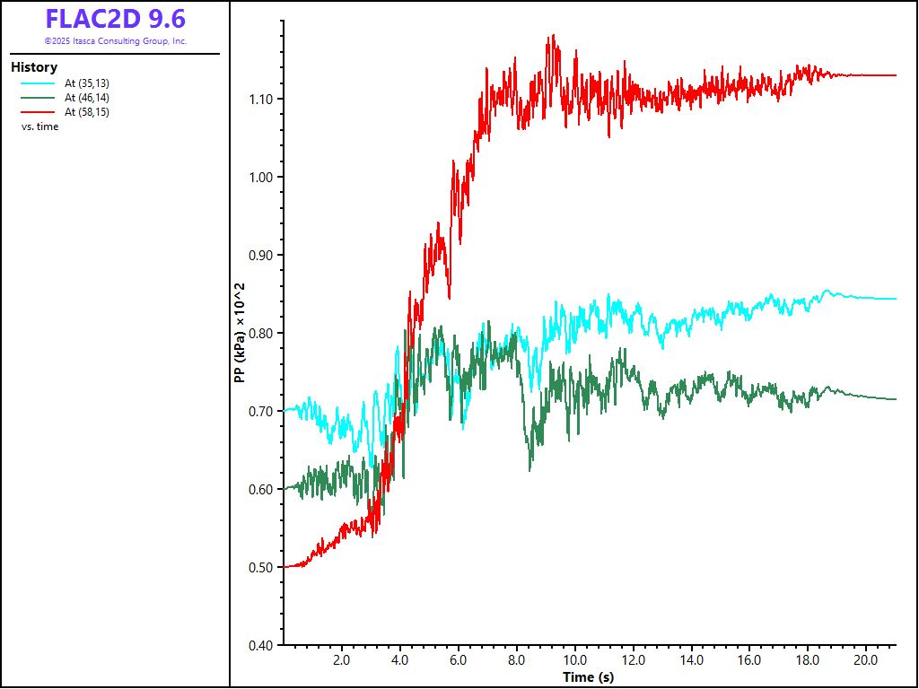 The results for sand \(D_r\) = 0.50 (50%) are plotted in Figure 8 to Figure 10. Figure 8 plots pore-pressure histories at selected points (35,13), (46,14) and (58,15). Apparent excess pore-pressure builds-up are observed. Figure 9 plots the contour of the maximum shear strain. Figure 10 plots the \(x\)-displacement histories of the platform, the slope top, and the base. Interestingly, the lateral displacement of the platform is less than that of the slope, which is a common effect of soil-structure interaction. Specifically, the lateral spreading of the soil pushes the pile foundation, while the pile foundation reinforces the stability of the slope to some extent.