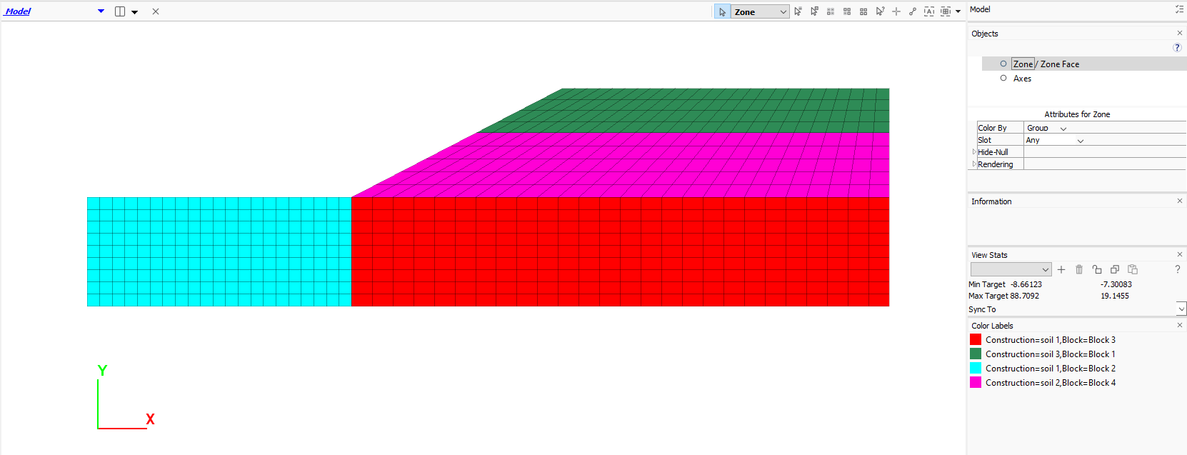 Select the block representing the top layer and assign it the group name “soil 3”. Set the middle layer to “soil 2” and the two blocks comprising the bottom layer to “soil 1”.