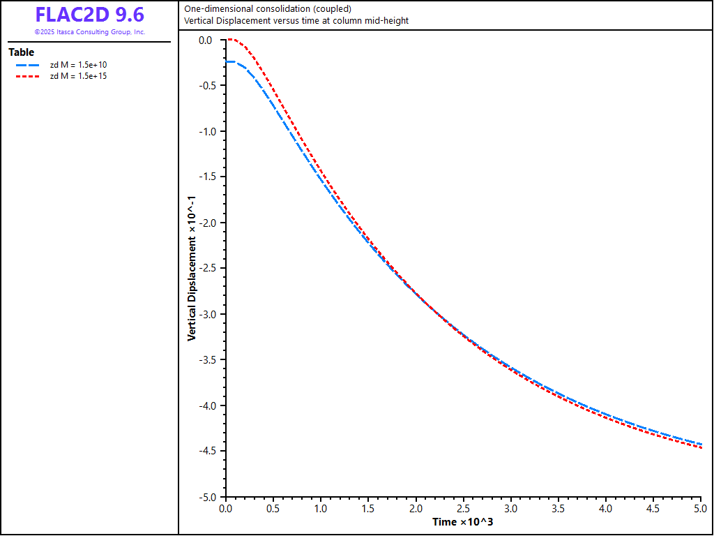 This particular example involves fully saturated coupled flow. In such cases, solution times can be reduced by using the saturated fast-flow algorithm described in Fully Saturated Fast Flow. The algorithm is selected by using the zone fluid fastflow on command. If 1DConsolidation-Coupled.dat with \(M\) = 4 × 1010 Pa (\(R_k\) = 52) is repeated with this command, the runtime is now approximately 12 seconds (see 1DConsolidation-FastFlow.dat). As \(R_k\) increases, the use of the fast-flow algorithm becomes more beneficial.