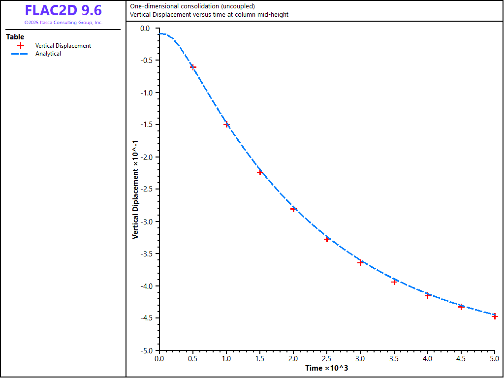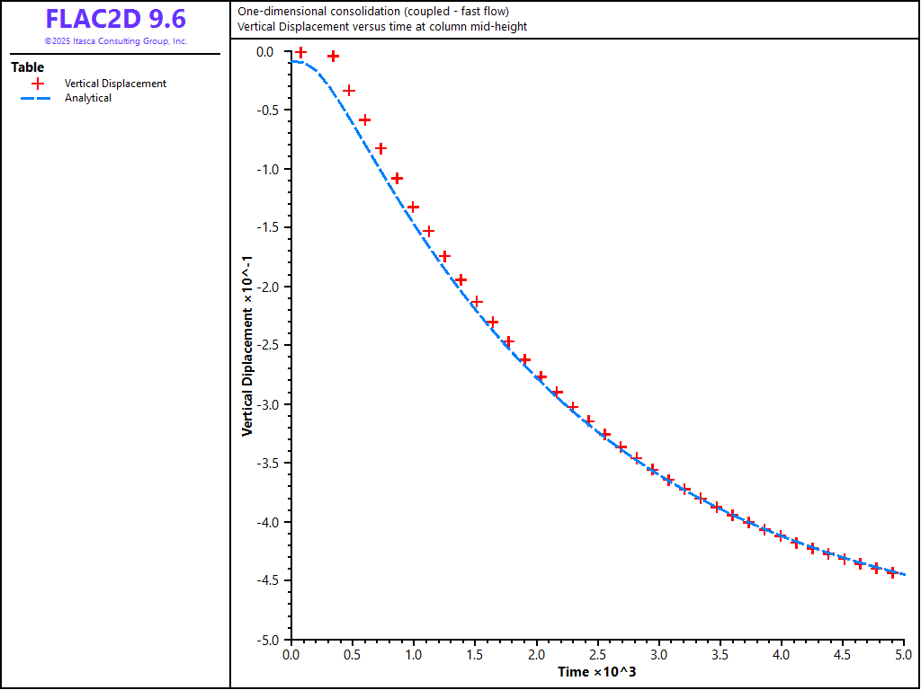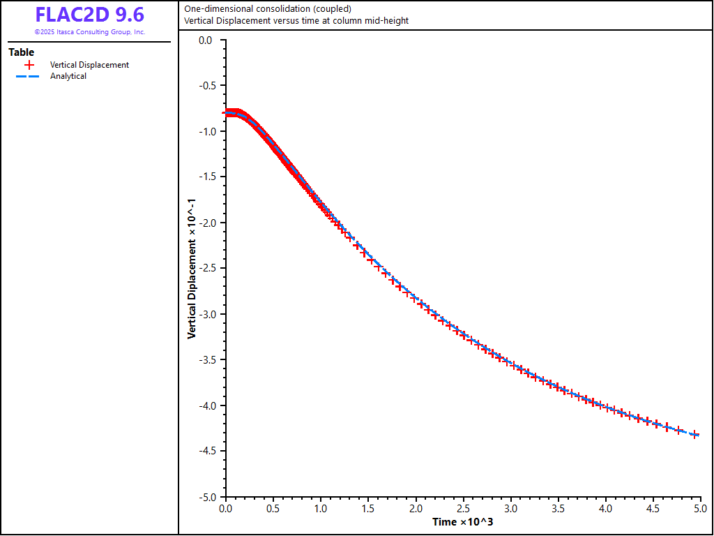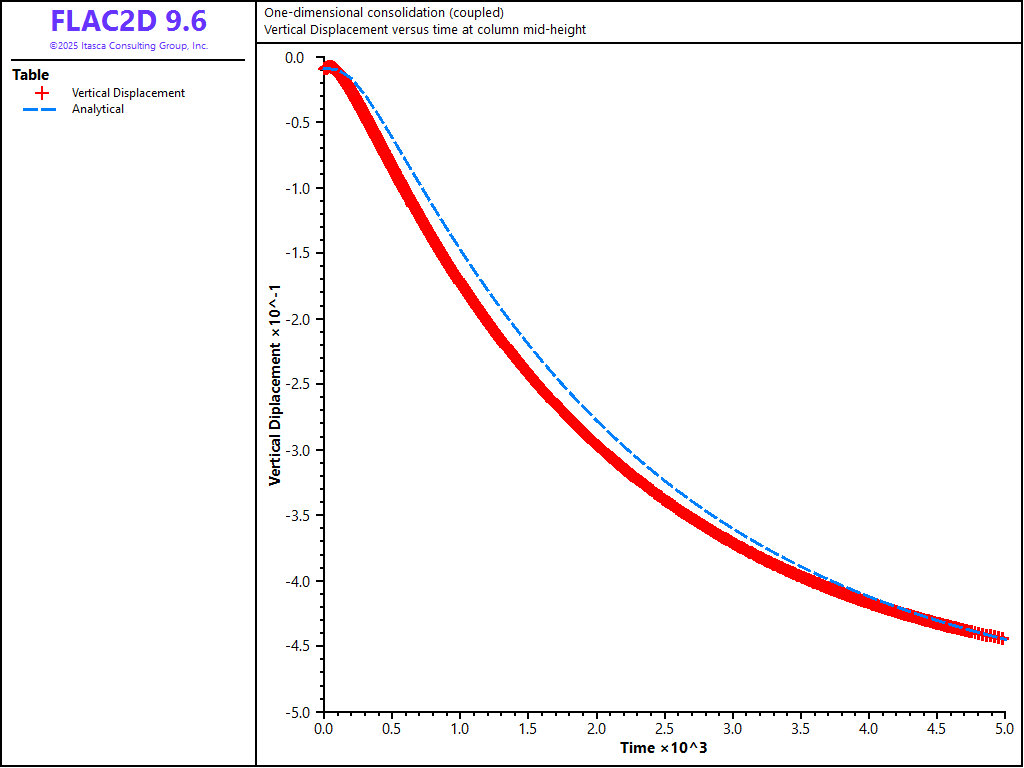 Figure 4: Comparison between analytical and numerical values for vertical displacement in a 1D consolidation test — \(M\) = 4 × 109 Pa.