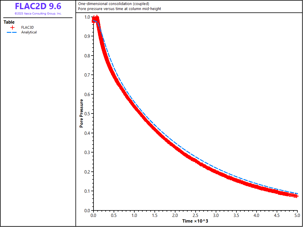 Figure 3: Comparison between analytical and numerical values of pore pressure in a 1D consolidation test — \(M\) = 4 × 109 Pa.
