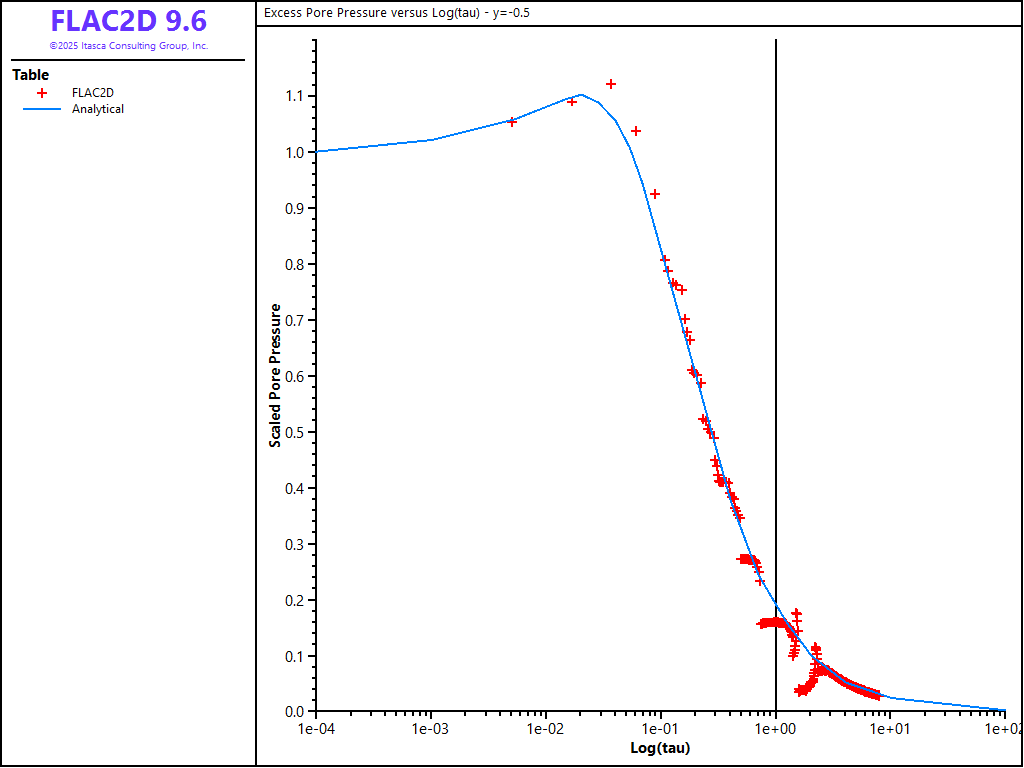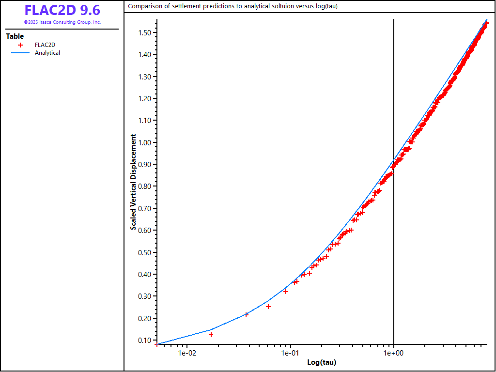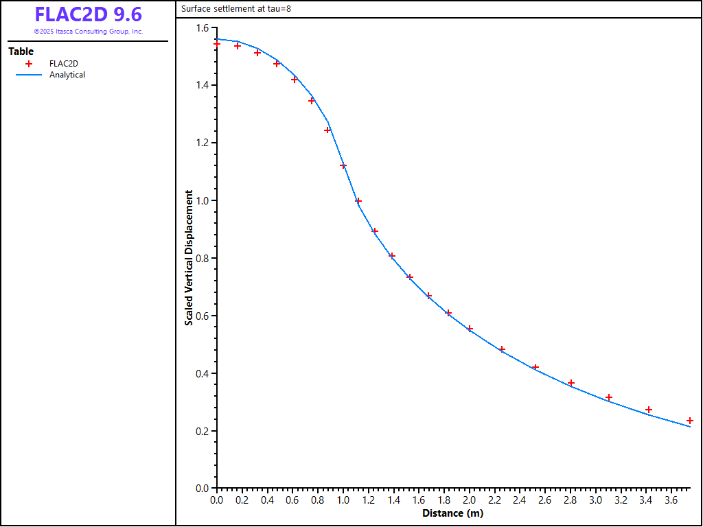 The surface consolidation settlement calculated by FLAC2D at the end of the simulation (\(\tau\) = 8) is compared to the analytical solution in Figure 3. The results are in good agreement. The discrepancy observed away from the strip location is attributed to boundary effects. This discrepancy can be reduced by increasing the model lateral and vertical extents.