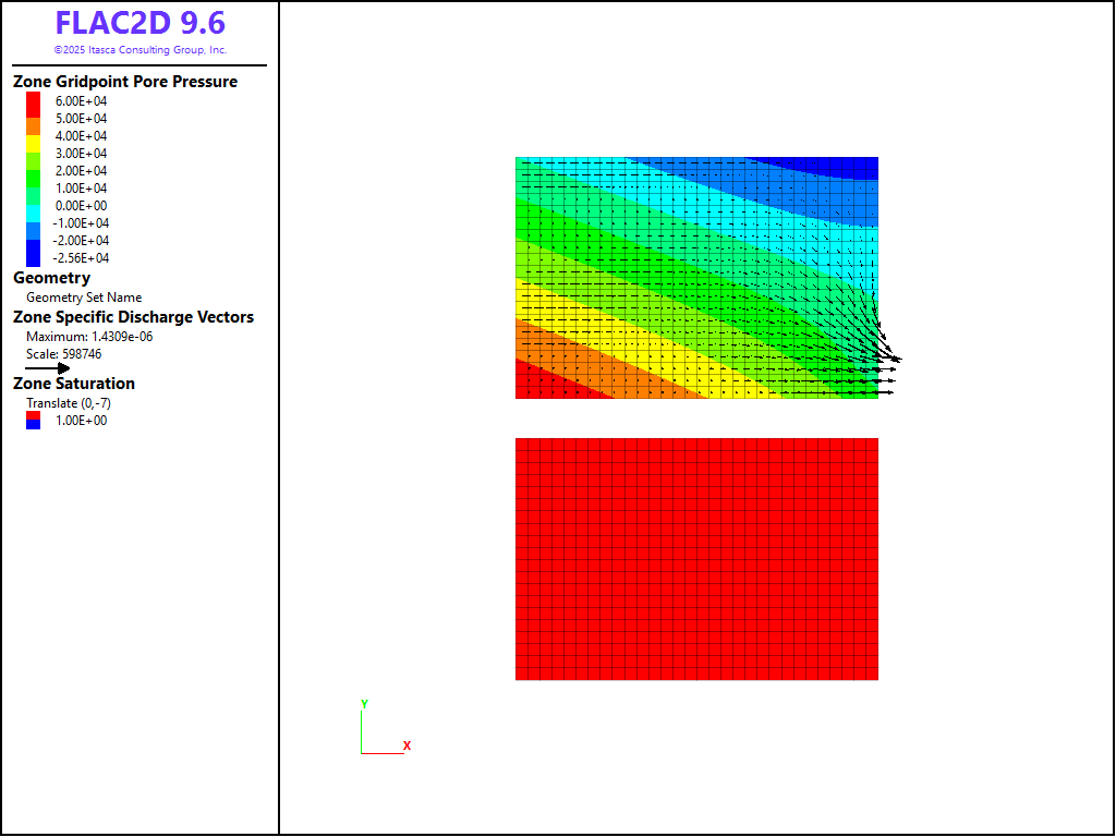 The material properties are assigned as described above. Because only the steady-state fluid flow solution is of interest in this problem, the mechanical behavior of the soil and its interaction with the groundwater flow are not addressed. The absolute values of soil density, homogeneous permeability and porosity are not relevant to the final solution, and the water bulk modulus is given a small value, compatible with free surface numerical stability, to speed up the calculation to steady state.