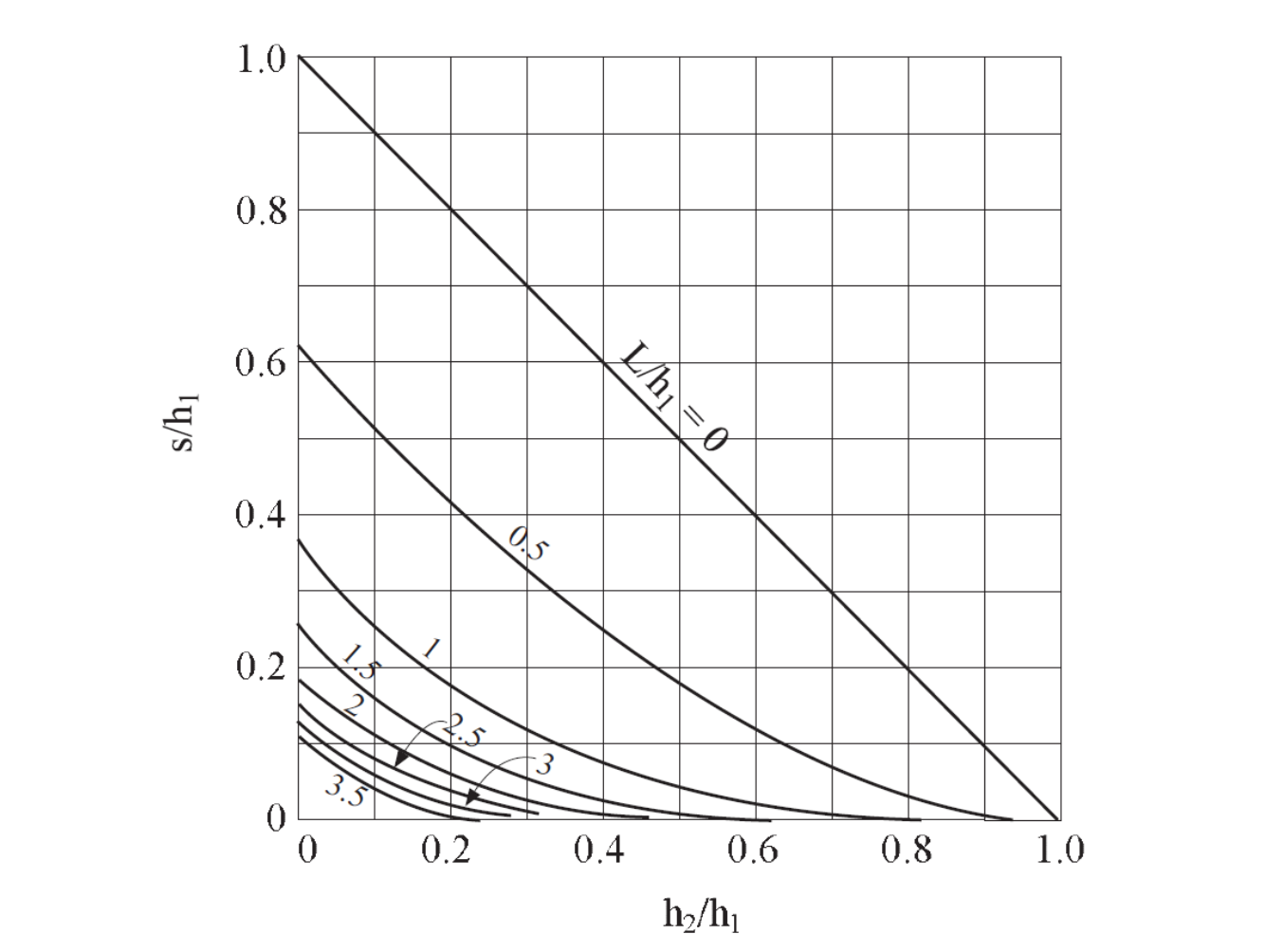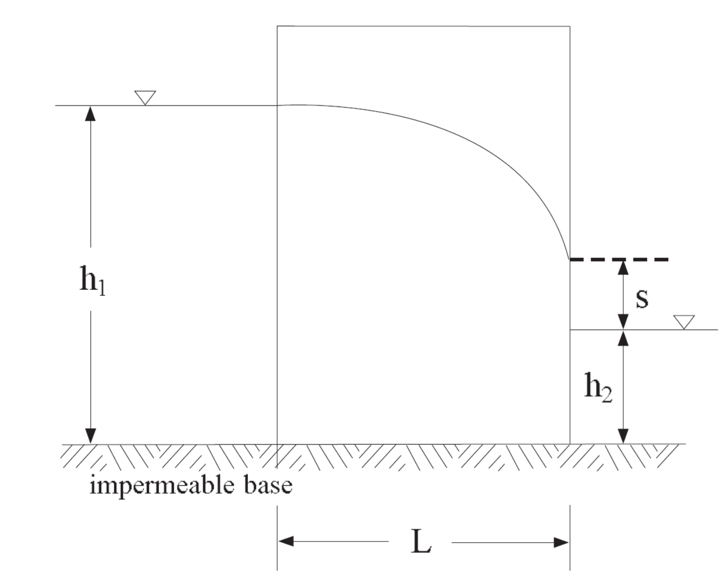 For this particular case, the value for \(Q\) is 1.92 × 10−6 m3/s. The length, s, of the seepage face as a function of the characteristic dimensions of the section was obtained by Polubarinova-Kochina and is given in Figure 2 (see, e.g., Harr 1991, pp. 206-207). For this particular problem, \(h_2/h_1 = 0.2\), \(L/h_1 = 1.5\), and the value of \(s/h_1\) is evaluated from the graphs at 0.1, which gives an elevation \(s\) = 0.6 m.