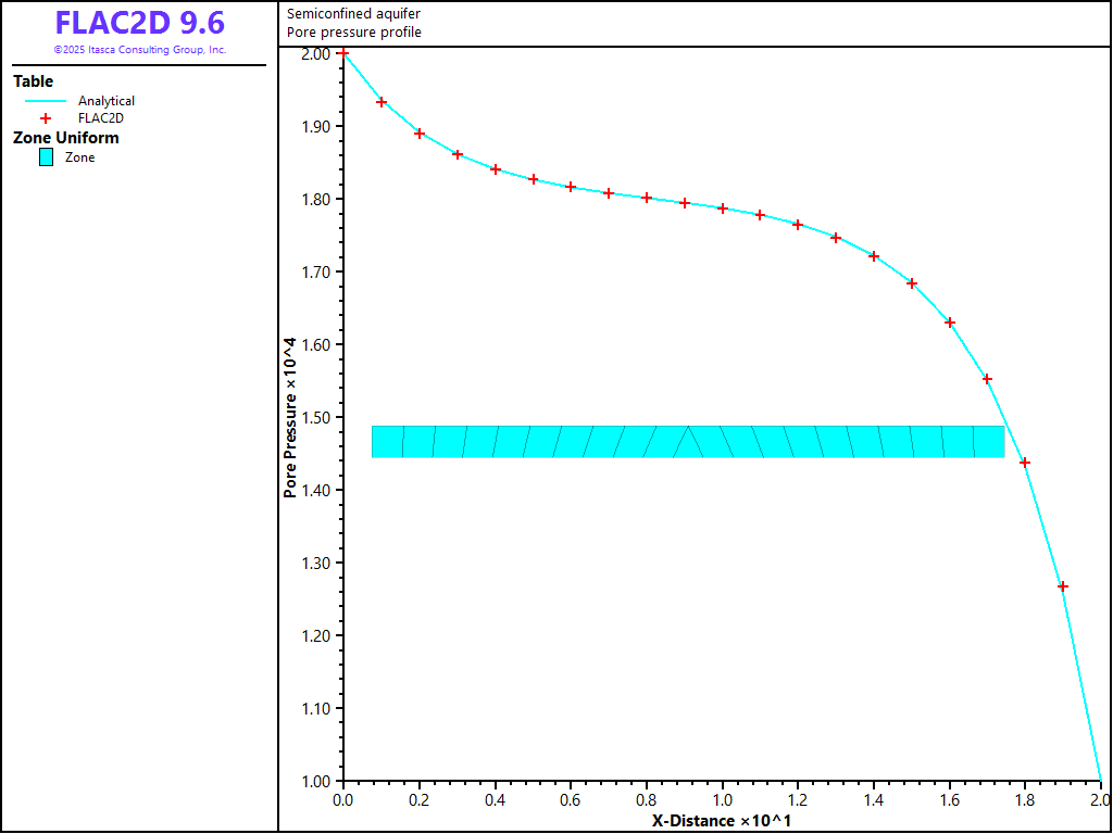 The FISH function checkit compares the amount of leakage calculated by FLAC3D to the solution of (7) at steady-state flow. The difference is printed (in a FISH dialog message) to be 0.03%. The analytical and numerical pore pressure profiles recorded along the base of the model, from \(x\) = 0 to \(x\) = 20, are compared in Figure 2.
