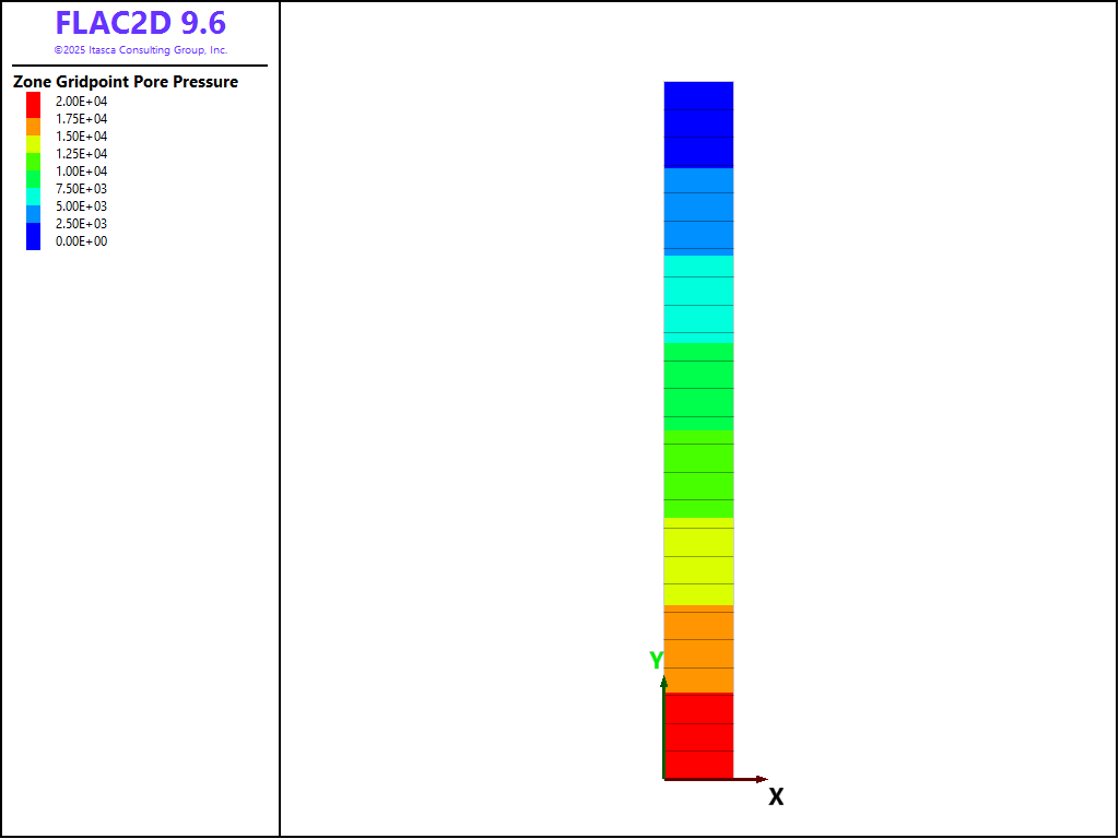 In the FLAC2D model, the layer is defined as a column of 25 zones. The excess pore pressure is fixed at the value of 2 × 104 Pa at the face located at \(z\) = 0, and at zero at the face located at \(z\) = 100 m. The model grid is shown in Figure 2.