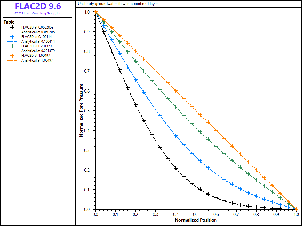 The analytical solution is programmed as a FISH function for direct comparison to the numerical results at selected fluid-flow times corresponding to \(\hat{t}\) = 0.05, 0.1, 0.2 and 1.0. The analytical and numerical pore-pressure results for these times are stored in tables.